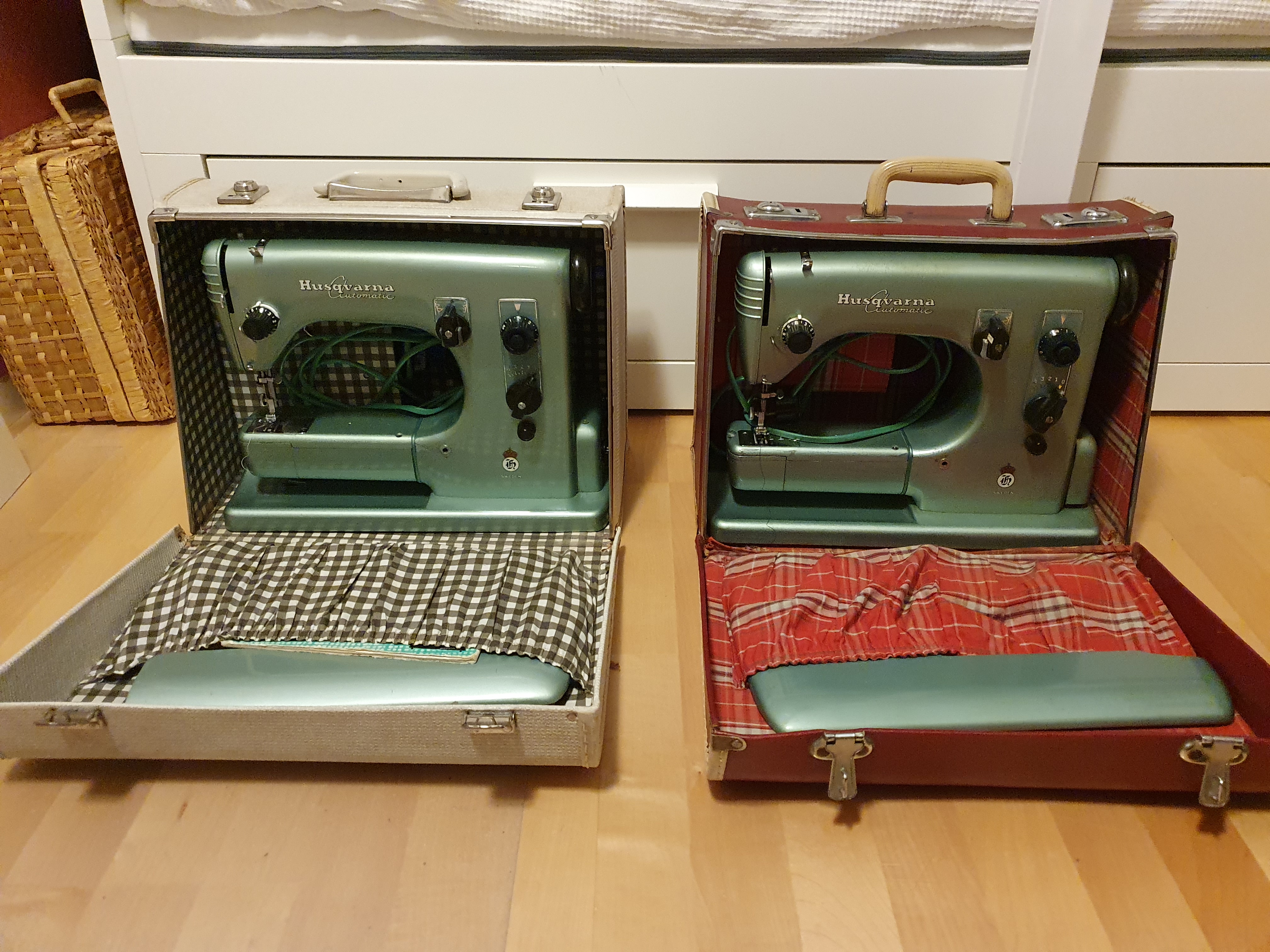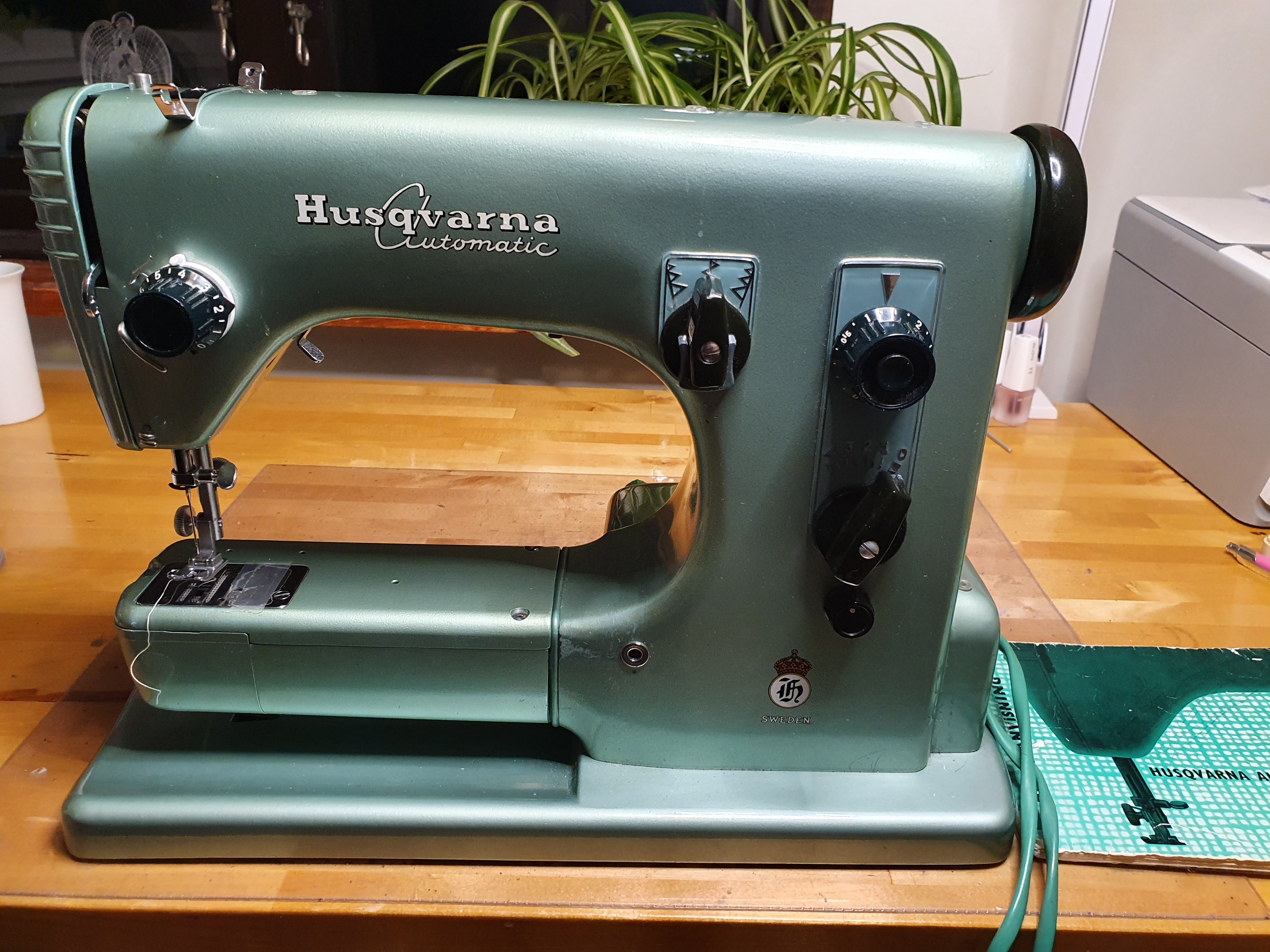 Det här är symaskinen jag lärde mig sy på – en Husqvarna Automatic troligen jämngammal med mig, alltså runt 60 år. Jag har för mig att mor fick den av sin far – alltså min morfar – när hon var nygift. Hon har sytt massor av kläder till mig och min syster med den, till och med dockorna fick matchande klänningar.