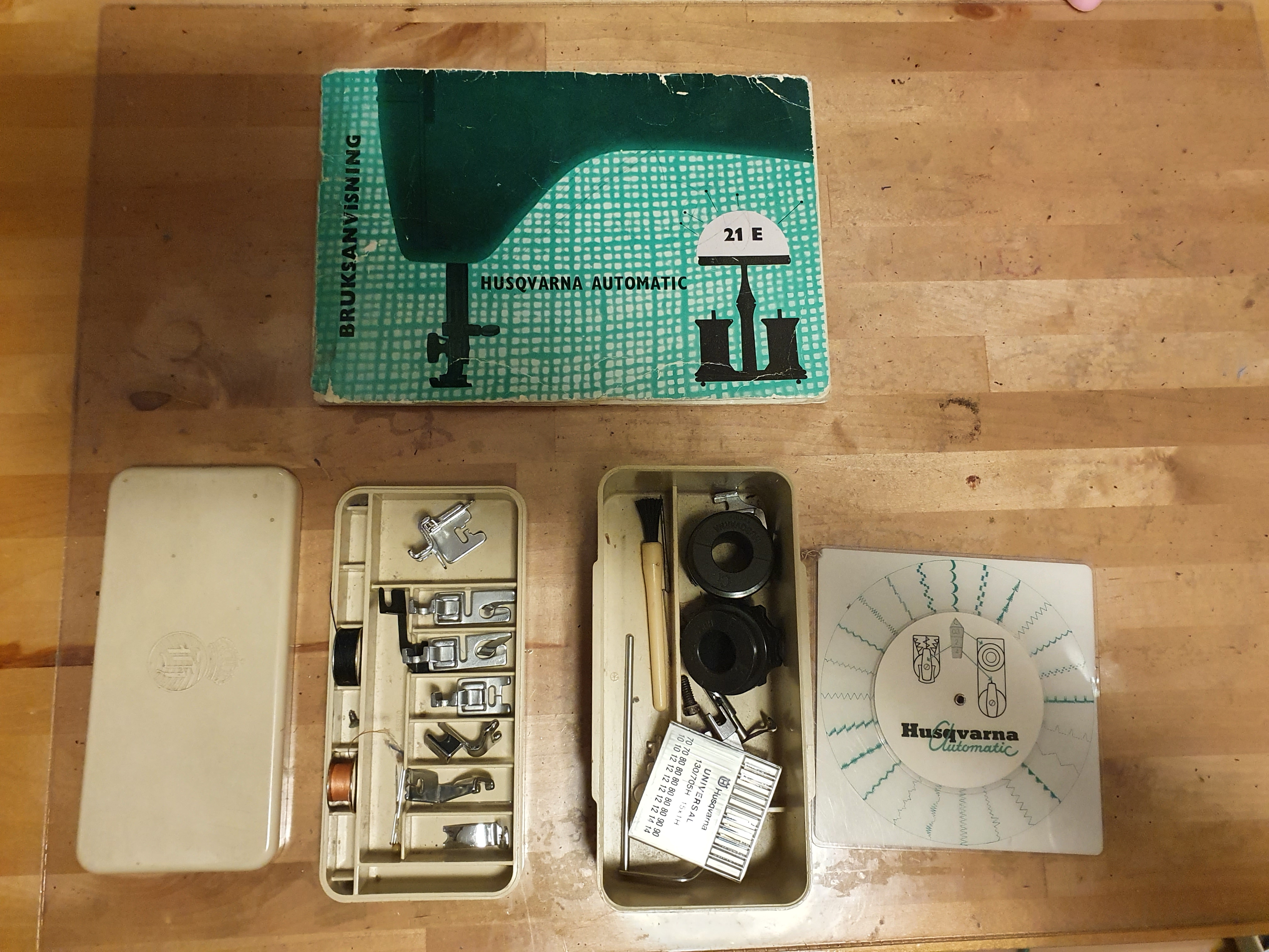 Det är egentligen en helt otrolig historia hur jag fick den: rektorn på den skola jag arbetade på då hade fått ta hand om en del saker efter en släkting som gått bort, bl.a. en korg med diverse sömnadsrelaterade saker. Hon tänkte att det kunde vara något i korgen som kunde användas i textilslöjden så hon tog med korgen till skolan. Och i korgen låg denna instruktionsbok – till just den symaskinsmodell som jag har fått ta över efter Uffes mormor. Men jag kan inte sy så bra på den än. Det är det här med trampningen …
