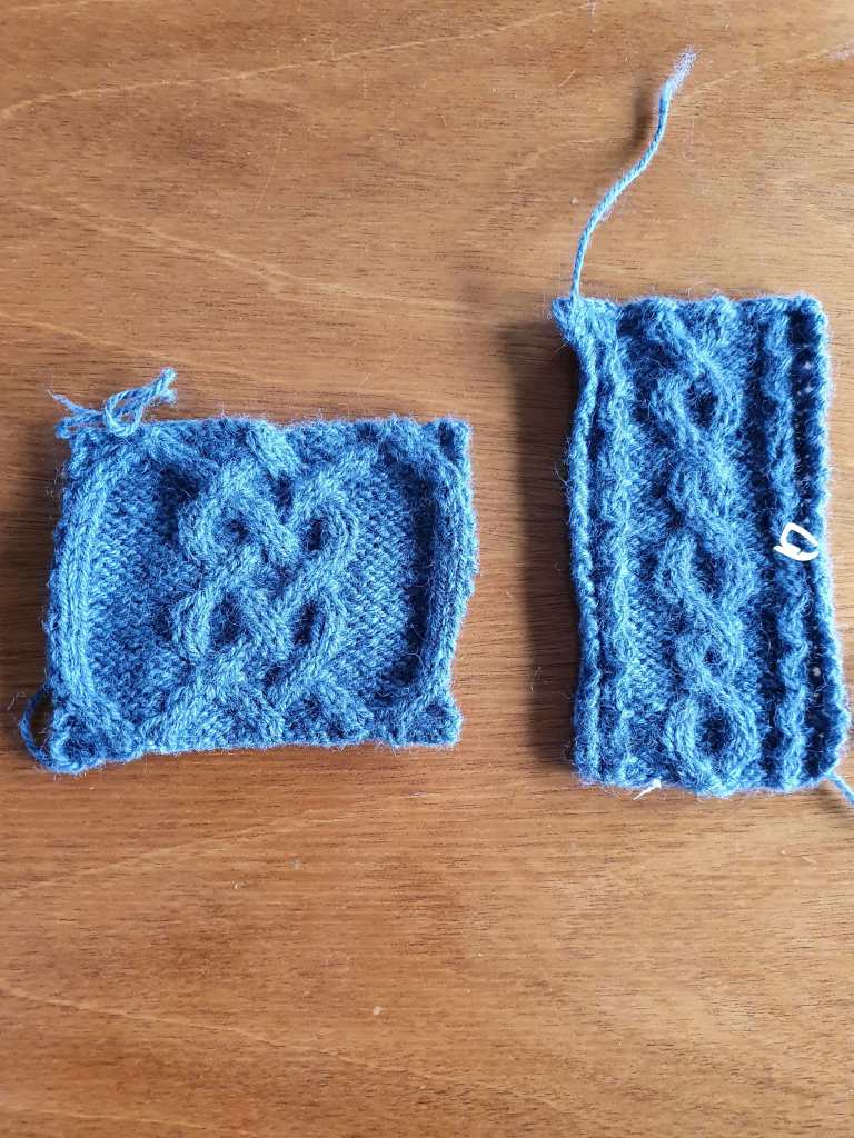 Stickningen är ett nytt projekt. Mors top är färdig – en månad före deadline! – men mer om den en annan dag. Här är det en Shannonmore på gång. Den är till David, min ena svärson. Han blev inte riktigt firad när han fyllde 40 så jag tänkte att jag ska sticka en tröja åt honom när han fyller 45 istället. Han har sagt att han tycker att Aran-tröjor är fina och egentligen skulle det nog vara en traditionell vit, men jag kunde inte motstå den här blå färgen som jag tänker kommer passa David jättebra. Garnet är Kampes tretrådiga ullgarn och den vackra blå färgen heter Kattegatt vilket ju är passande när man bor på västkusten. Jag provstickade flätmönstren innan jag visade modellen för David så att jag visste att projektet var görbart. Faktiskt var det de minsta flätorna, de som ser ut som spritsad grädde, som var knepigast att förstå hur man ska få till.