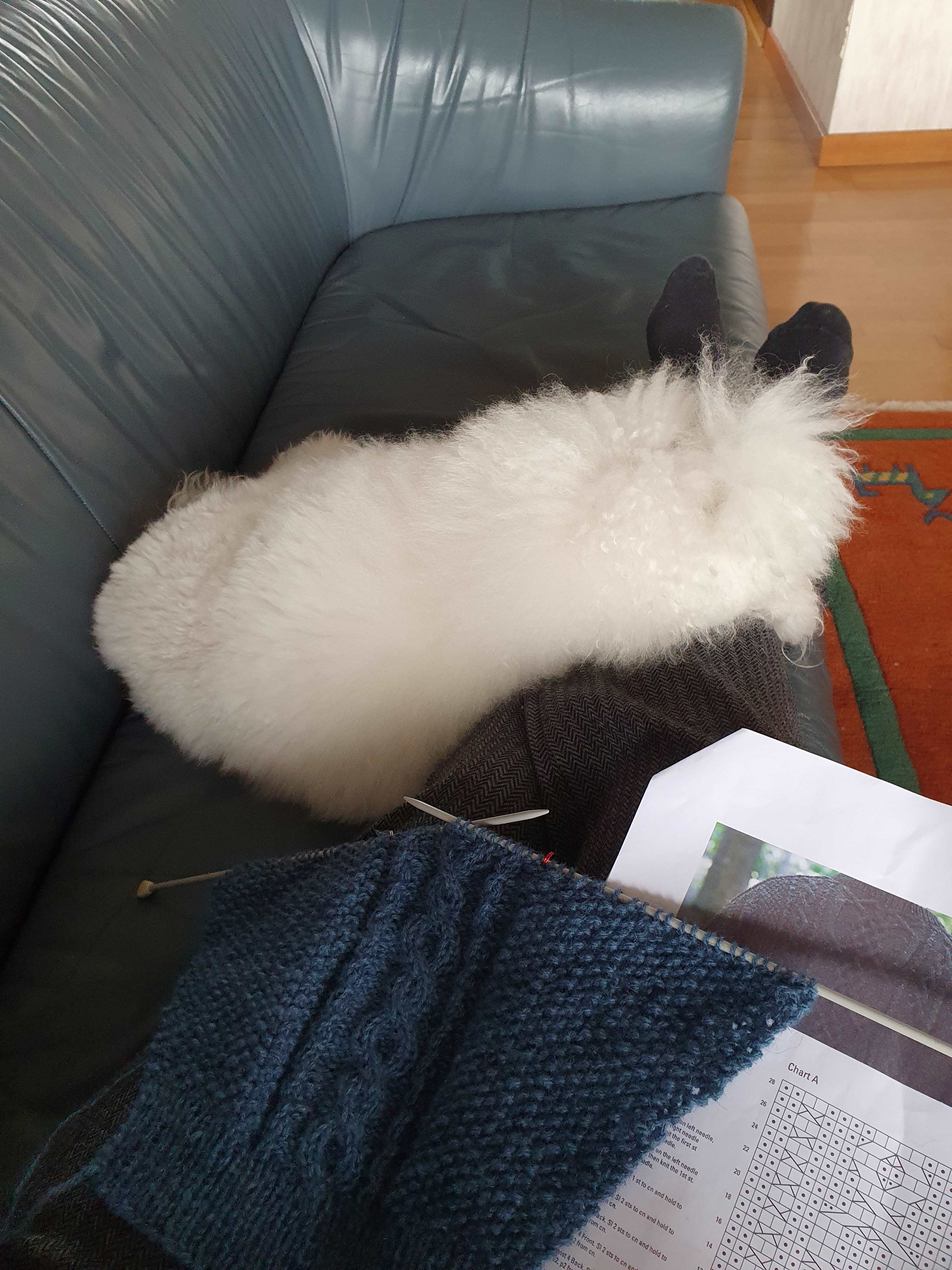 Efter badet behövde både Fendi och jag ta igen oss så vi intog soffan. Här sitter jag nu med hund och stickning i knät – kan man ha det bättre?