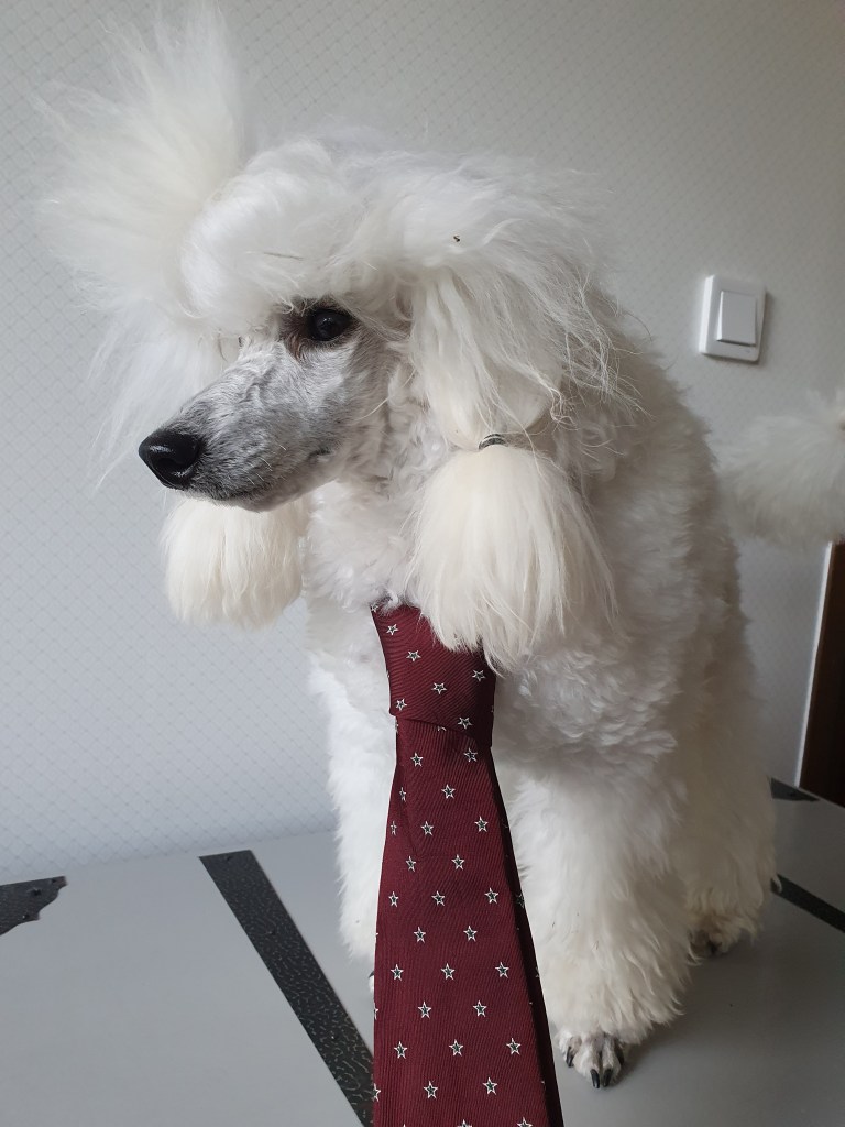 … sytt av en sidenslips, köpt secondhand. Efter att jag sytt halsbandet – men innan vi gick ut i regn – fick jag för mig att kolla om tyget var färgäkta. Det var det INTE. Den vita fuktade tyglapp som jag gnuggade med blev rosa. Så det här har Fendi bara fått ha ”till fint”, annars kanske han blivit som en polkagris.