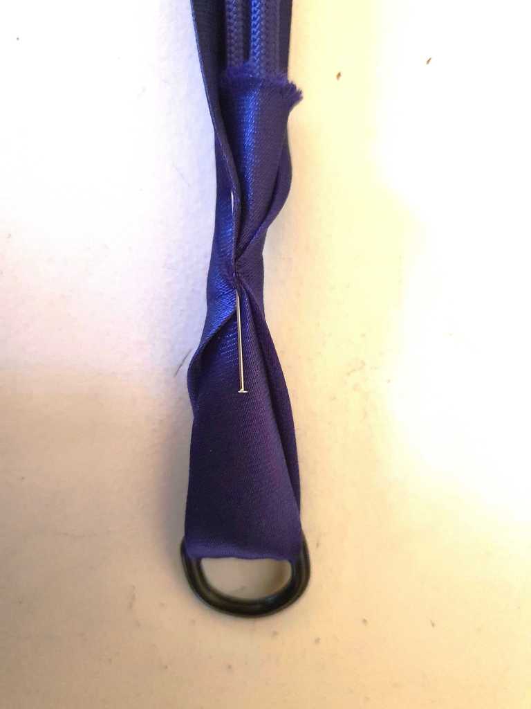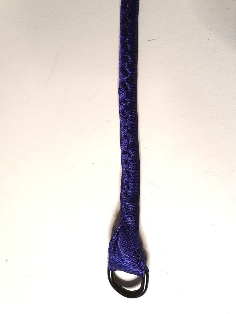 Att dubblera linan gjorde att jag behövde skarva ihop början med slutet och jag prövade att smälta ihop ändarna. Jag fick efter flera försök till en hållbar smältskarv, men det blev som en jättehård klump. Oskönt mot en hundhals! Nu har jag testat en annan variant med sydd skarv. Innan jag klädde in halsbandet i ”siden” fotograferade jag för att minnas hur jag gjort. Jag kanske vill sy fler nu när jag tycks ha fått till en fungerande lösning. Och kanske du kan ha glädje av bilderna om du vill sy halsband till din pälskling du också.