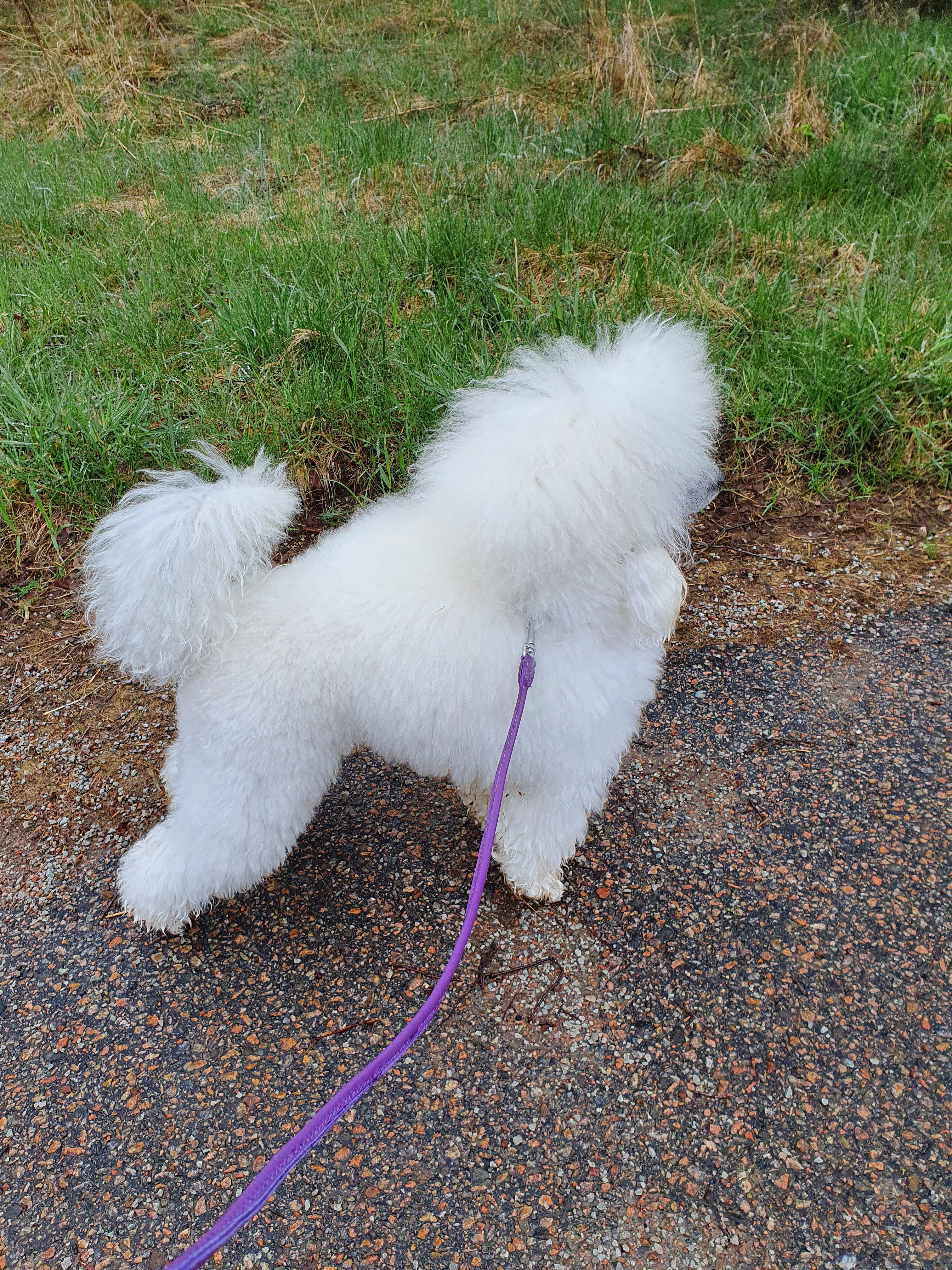 Nu har vi provgått halsbandet. Jag hittade faktiskt ett matchande koppel i lådan med paracordlina! Det köpte jag innan jag köpte hund, men har aldrig använt det för det har inte var lämpligt till en ystert gnagande valp. Men varför bry sig om det matchar? Ingen ser ju halbandet där inne i fluffet :).