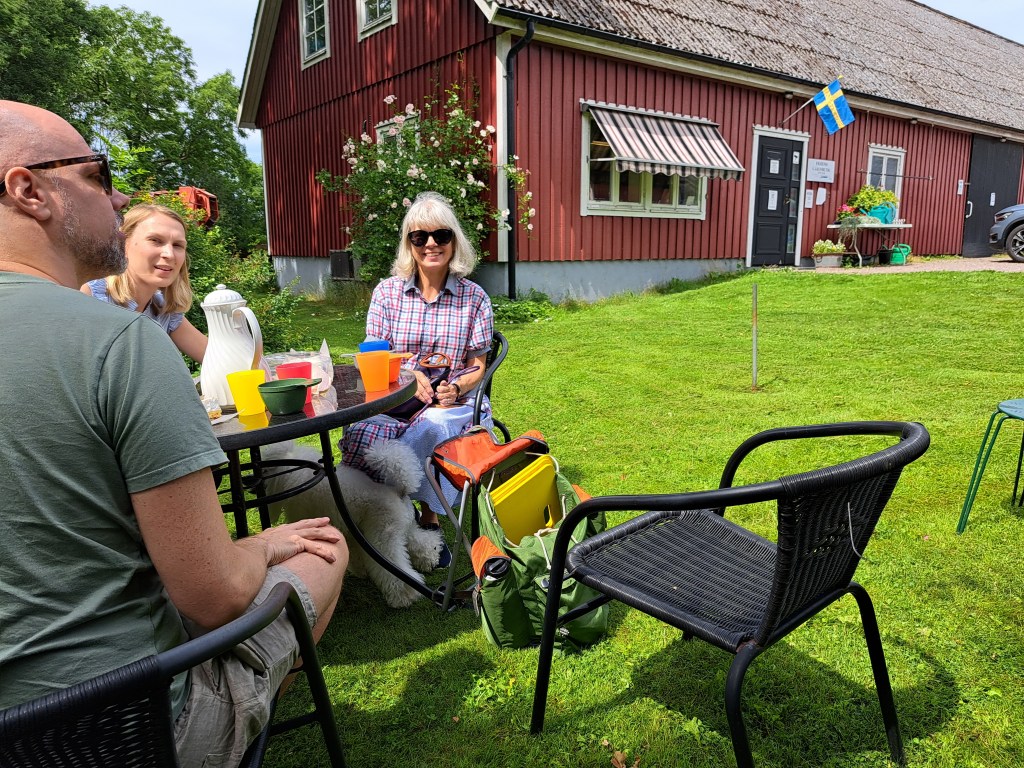När David kommer brukar han vilja att åka till Killeröds café på Hallandsåsen och äta deras fantastiska äppelmaräng med vaniljsås till. Med två hundar som inte riktigt kommer överens valde vi att köpa marängerna i en kartong för att ta med dem och äta någon annanstans än på själva caféet (annars erbjuder caféet en fantastisk utsikt över Skälderviken och en otrolig inomhusmiljö med guld och mosaik som inte låter sig beskrivas). I närheten ligger Ekhems gårdsbutik. Där hade inte Uffe och jag varit heller så vi hängde på när Ida och David ville åka dit. Och kan ni tänka er, när vi botaniserat runt i deras affär och köpt rabarberchutney, fläderblomssaft och marmelad på päron och ingefära erbjöd de oss att sitta i deras trädgård och äta vår äppelmaräng.