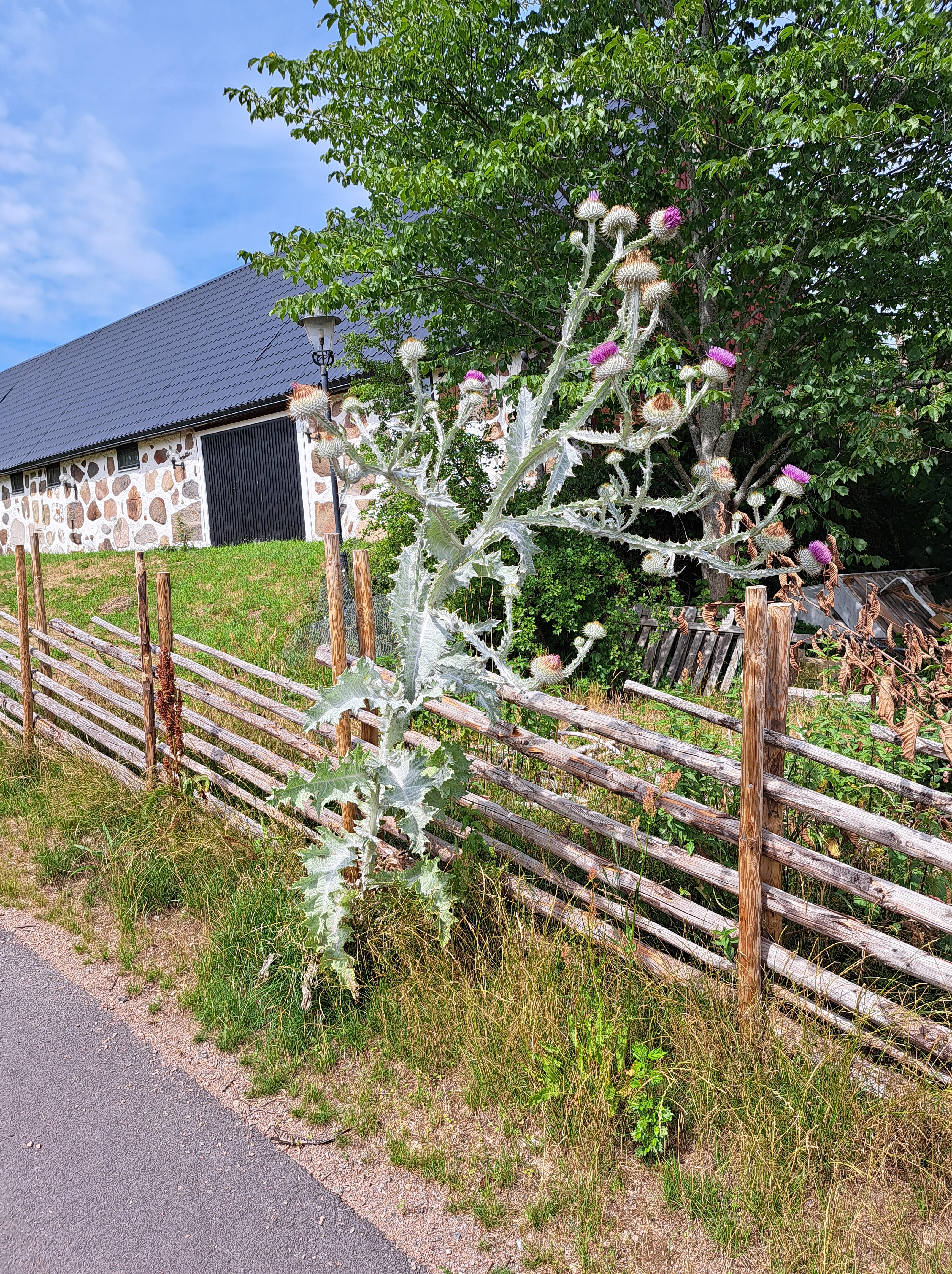 På Ekhems gård fick vi tips om en tyg- och sybehörsaffär i Förslöv som jag inte kände till. Så då måste vi ju åka dit också. Syknuten – affären – ligger i stenhuset på bilden. Det var Uffe som höll i kameran idag så han fotade denna otroliga tistel som växte bakom affären, men han var inte inne i själva affären … :).