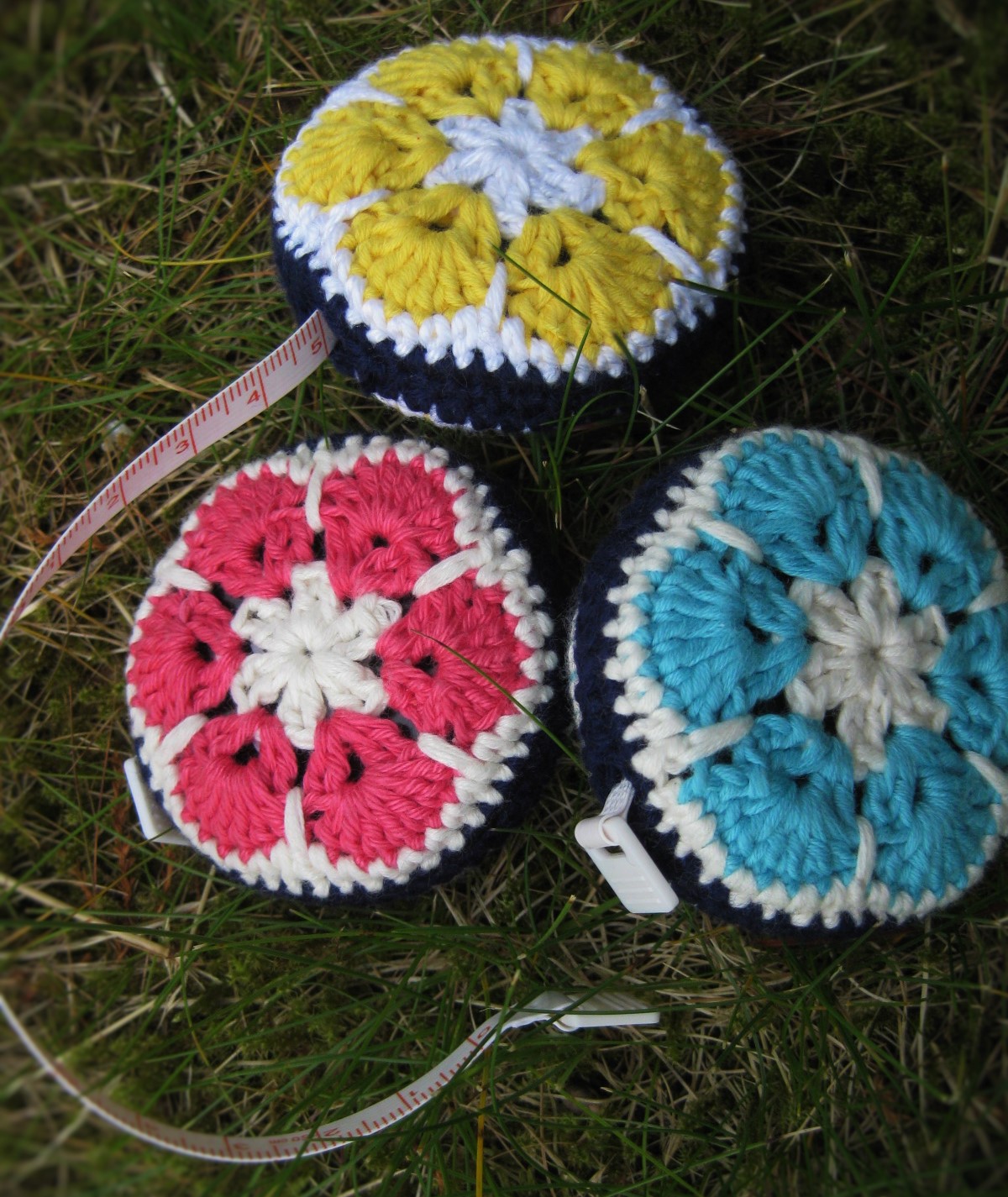 Dessutom finns tre tröstpriser i form av måttband med virkat fodral: tryck på mitten och måttbandet rullas in i fodralet. De kommer att se ut ungefär som de här, men färgerna får bli en överraskning.