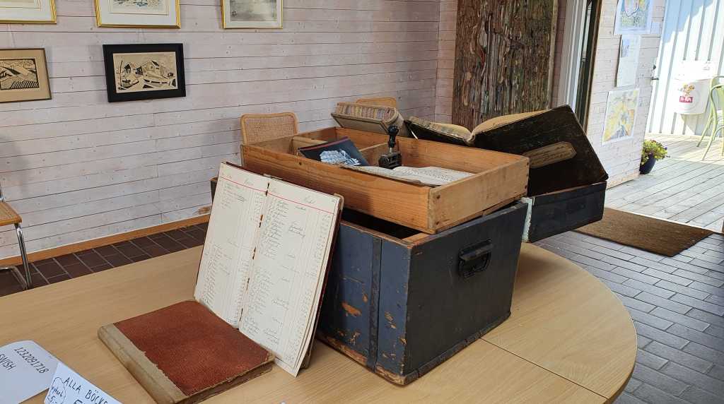 Söndrums hembygdsförening ställde ut foton och olika stenhuggarverktyg i Bastaskärs båthus, och man fick också se en kista som tillhört en av stenhuggarna och de här avräkningsböckerna.
