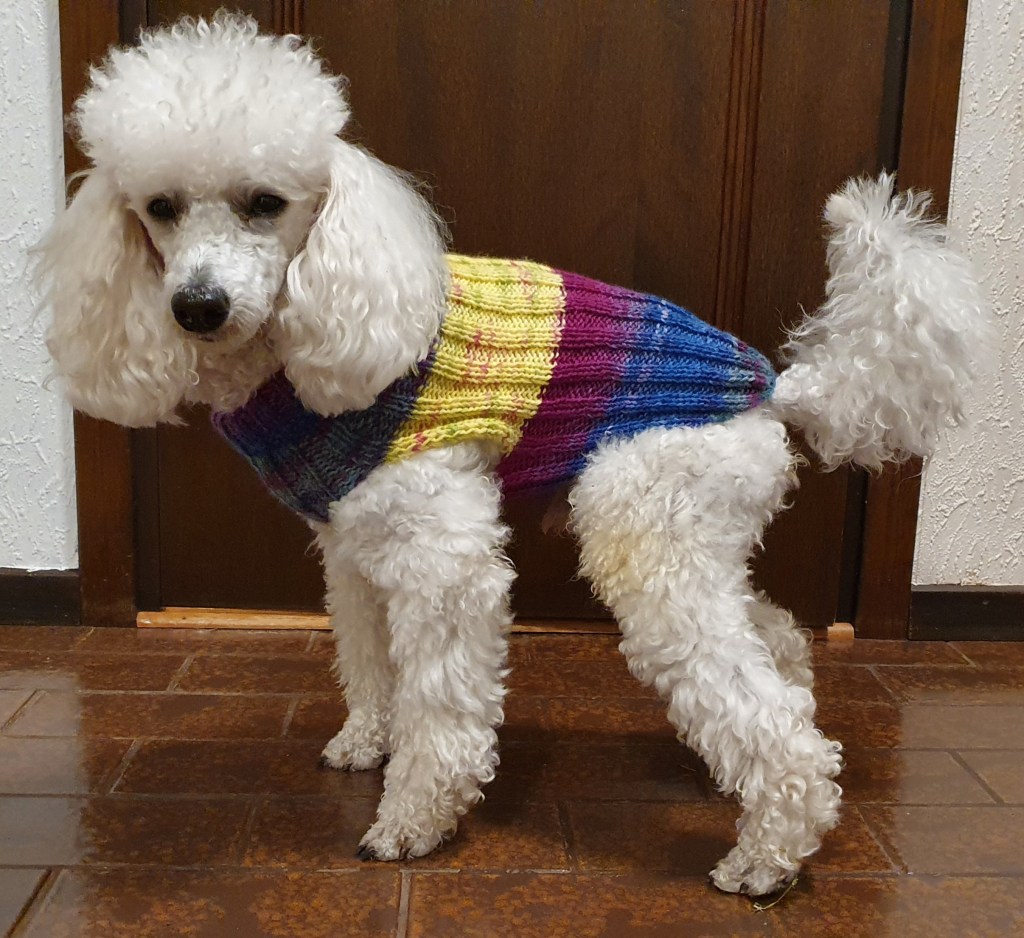 Dagen efter han blivit klippt var vi på första träffen på en Freestyle-kurs. Det började med ett teoripass då hundarna fick sitta kvar i bilarna medan mörkret sänkte sig utanför. Det blev faktiskt riktigt ruskväder med regn och rejäl blåst och vi var på en helt ny plats så egentligen är det väl inte så konstigt att Fendi kunde inte fokusera på nån sorts träning överhuvudtaget efter en kort stund. Han hade fullt upp med att hålla koll på vad som hände i utkanten av träningsplanen där det var lite småskumt. Till nästa kurstillfälle hade jag stickat en värmande väst till honom att ha i bilen i väntan på träning, men då fick vi vara inne i en träningshall istället så västen behövdes inte. Så här ser den ut i alla fall, stickad av restgarner efter en (modifierad) beskrivning ur Hemmets journal.