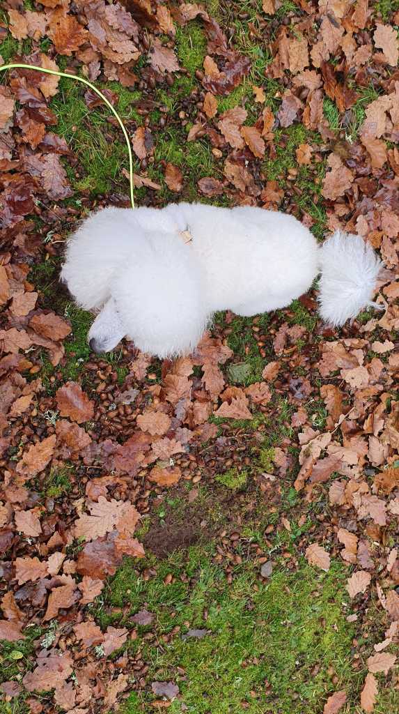 Nu är Fendi stor kille och hjälper till att ”räfsa”. Lite koll får man ha på honom, ekollon med grodd var nåt nytt så det måste han ju undersöka … Långlina och sele är på för vi har inget staket runt tomten så om nån annan hund passerar måste vi kunna hejda Fendi. Han vill gärna vill leka med andra hundar, men hans ystra närmanden uppskattas inte av alla så för allas trevnad är det lina på som gäller när tvåbeningarna jobbar i trädgården.