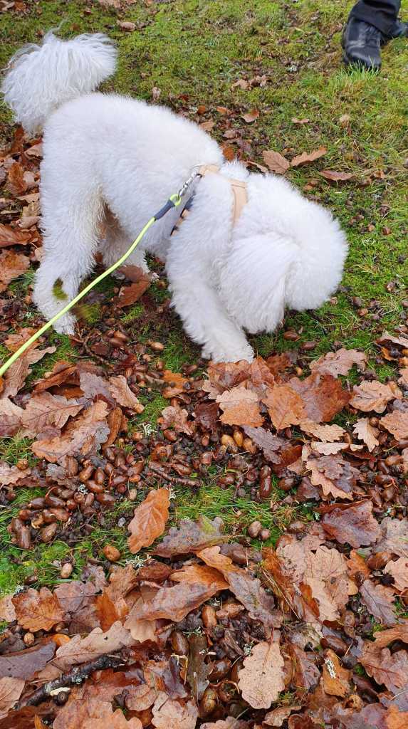 Idag har vi räfsat löv. Vi fick ihop 17 sopsäckar med löv och ekollon! Det måste vara någon sorts ekollonår i år, tror aldrig vi har haft så många som i år. Vi har ett par stora ekar på tomten och jag tycker de är jättefina, men samtidigt var jag lite orolig för vad som skulle kunna hända när vi skaffade valp eftersom ekollon kan vara skadligt för hundar.