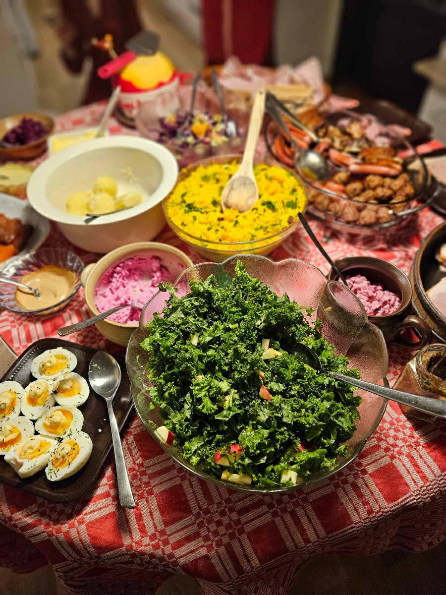 I Halland äter man grönkål till jul, men jag tillagar den inte på traditionellt vis utan vi äter den som sallad tillsammans med tärnat äpplet och en dressing på rapsolja och pepparrot (också från Halland). Rödkål äter vi också i salladsform: med apelsin och granatäpple. Testade nytt recept i år, men förra årets var nog snäppet bättre för den innehöll även fänkål. Mmm! En annan rätt som vi brukar ha till jul är saffrancouscous med russin och aprikoser. Och så har vi en rödbetstsatsiki med fetaost som är jättegod till skinkan.