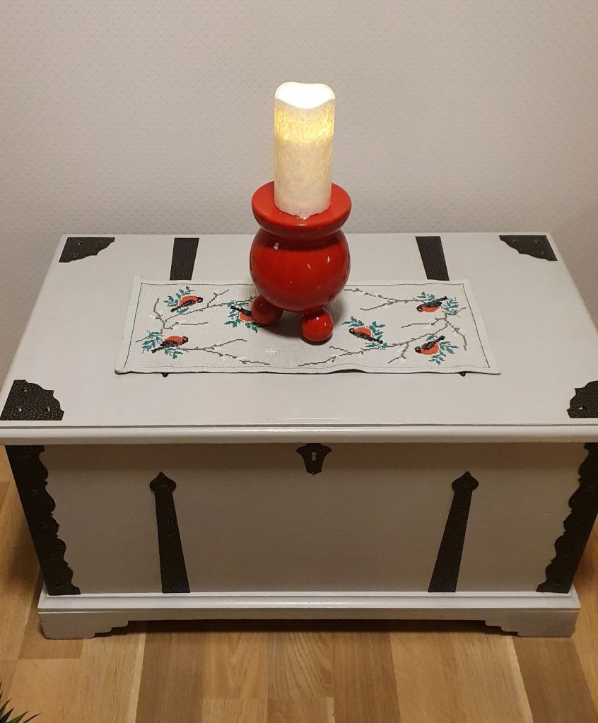 I år skulle vi inte ha några julklappar alls först, sen kom syrran på att vi kunde ge varandra sådant som vi hade men kanske inte använde längre och som kanske någon annan i familjen kunde ha glädje av. Det blev riktigt lyckat. Jag gav böcker till alla och fick själv en halv årgång av tidningen Vi, en vacker anteckningsbok och en duk som min farmor broderat. Duken passar perfekt på kistan i köket.