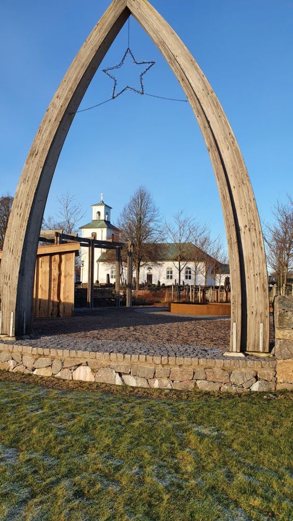 Vi gick till vår fina kyrka, Enslövs kyrka. Häromåret invigdes ett nytt gravplatsområde intill kyrkan. Det är mycket vackert, vann arkitekturpriset 2021, så det är kanske synd att jag inte fotograferade så mycket av det, men du kan läsa mer om det här. Idag ville vi titta på den stora krubban som ställs fram varje jul. Den anas till vänster i bild