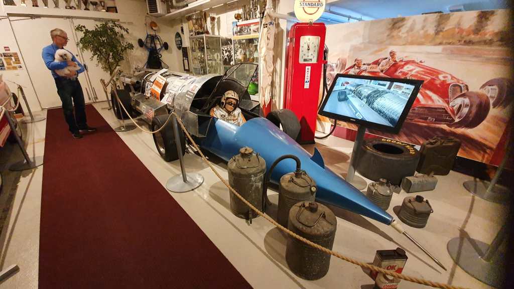 Den här bilen, Silver Streak Jet Mark II, är något alldeles extra. Den har kört fortare än någon annan bil i Europa enligt utställningstexten (570 km/h). Den är byggd av Arnold Sundqvist, född i Motala. Han presenterades som ”Sveriges mesta motordåre som har byggt, ägt och kraschat det mesta som går på hjul eller flyger”. Efter studier i USA kom han hem till Sverige med en nyinköpt jetmotor (!), ett flygplan och en häftig bil. Jetmotorn ser ni baktill på den här bilen. Första provturen med bilen blev lyckad, tyckte Arnold, och beskrivs målande: ”När efterbrännkammaren tände smälte firmans stålstaket, grannens skog började brinna och tre tunnor spillolja virvlade runt som höstlöv.”