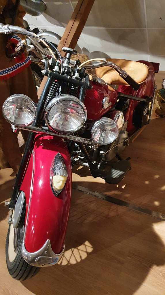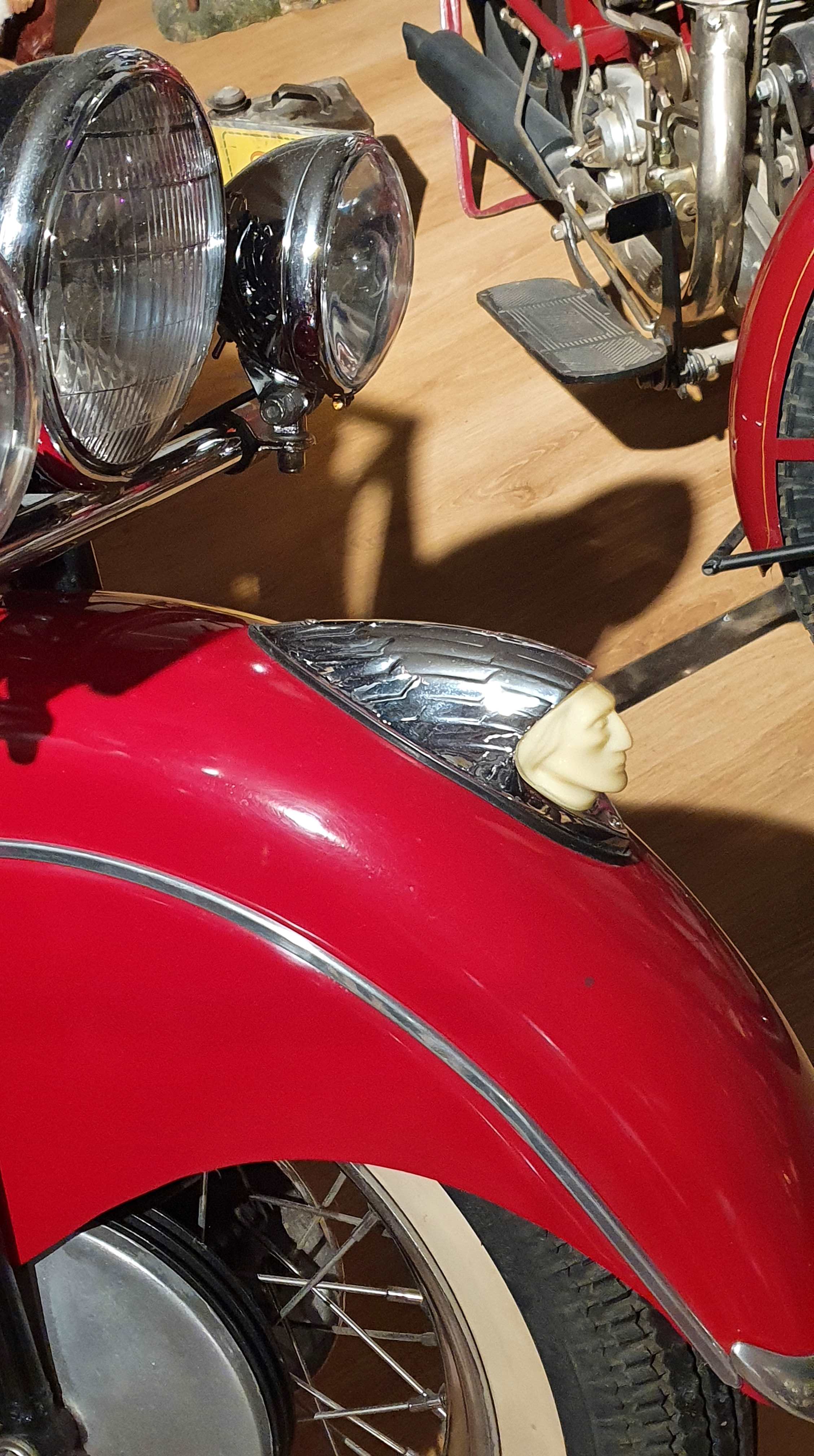 Sisten ut på det röda temat får bli en Indian-motorcykel. Min syster har en sån (fast några år nyare och utan indian där fram om jag minns rätt). Ni som följt min blogg ett tag känner till min vurm för kylarprydnader. Undrar vad den här indianen kallas – skärmprydnad kanske?