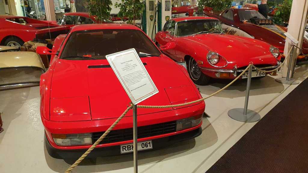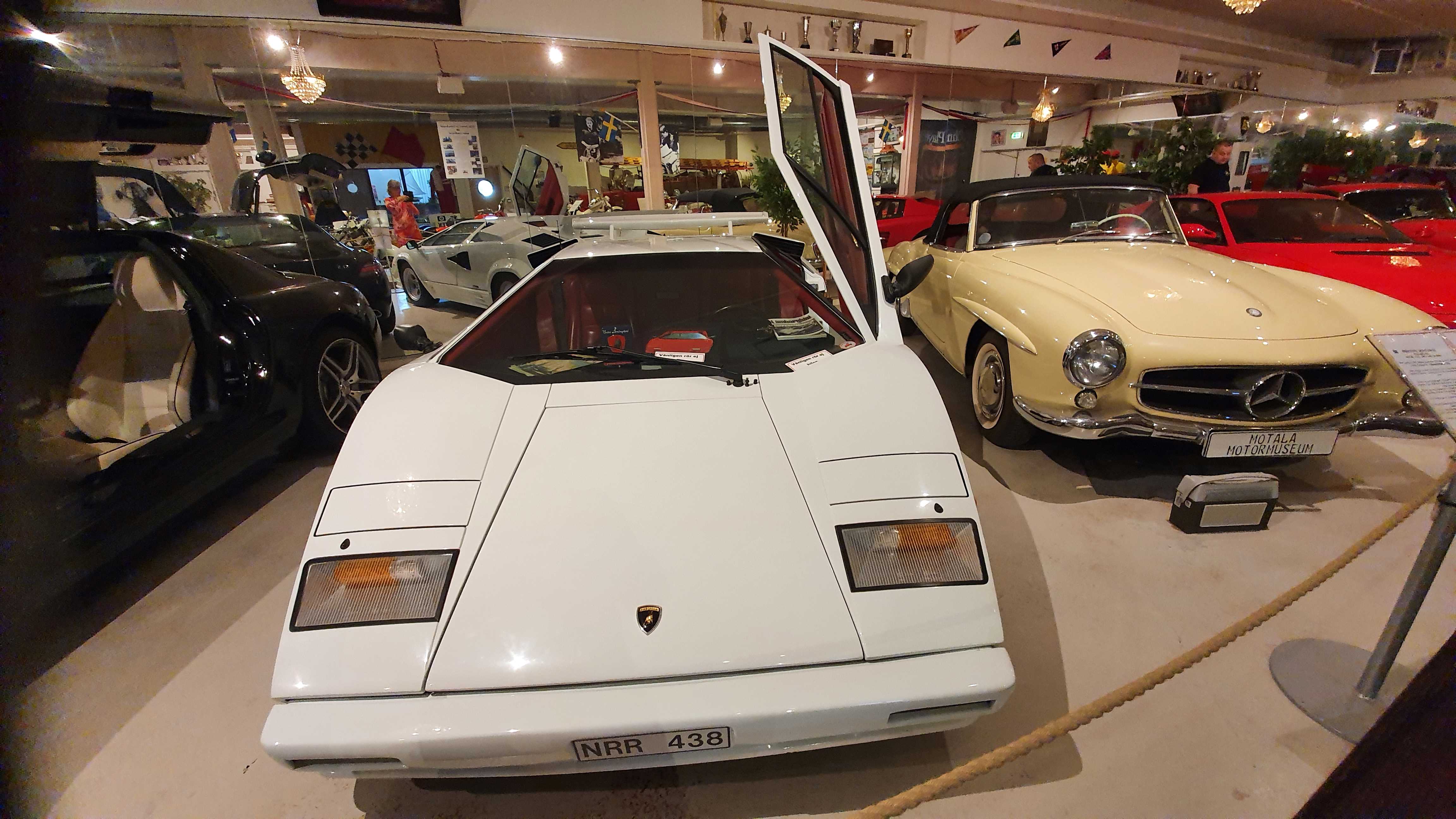Närmast i bild en Lamborghini Countach. Bilen är byggd för prestanda, inte komfort, stod det på informationsskylten som också talade om att bilen gör 0-100 på 4,5 sekunder. Man kan bli åksjuk för mindre. Mercedesen till vänster var nog lite mer i min smak.