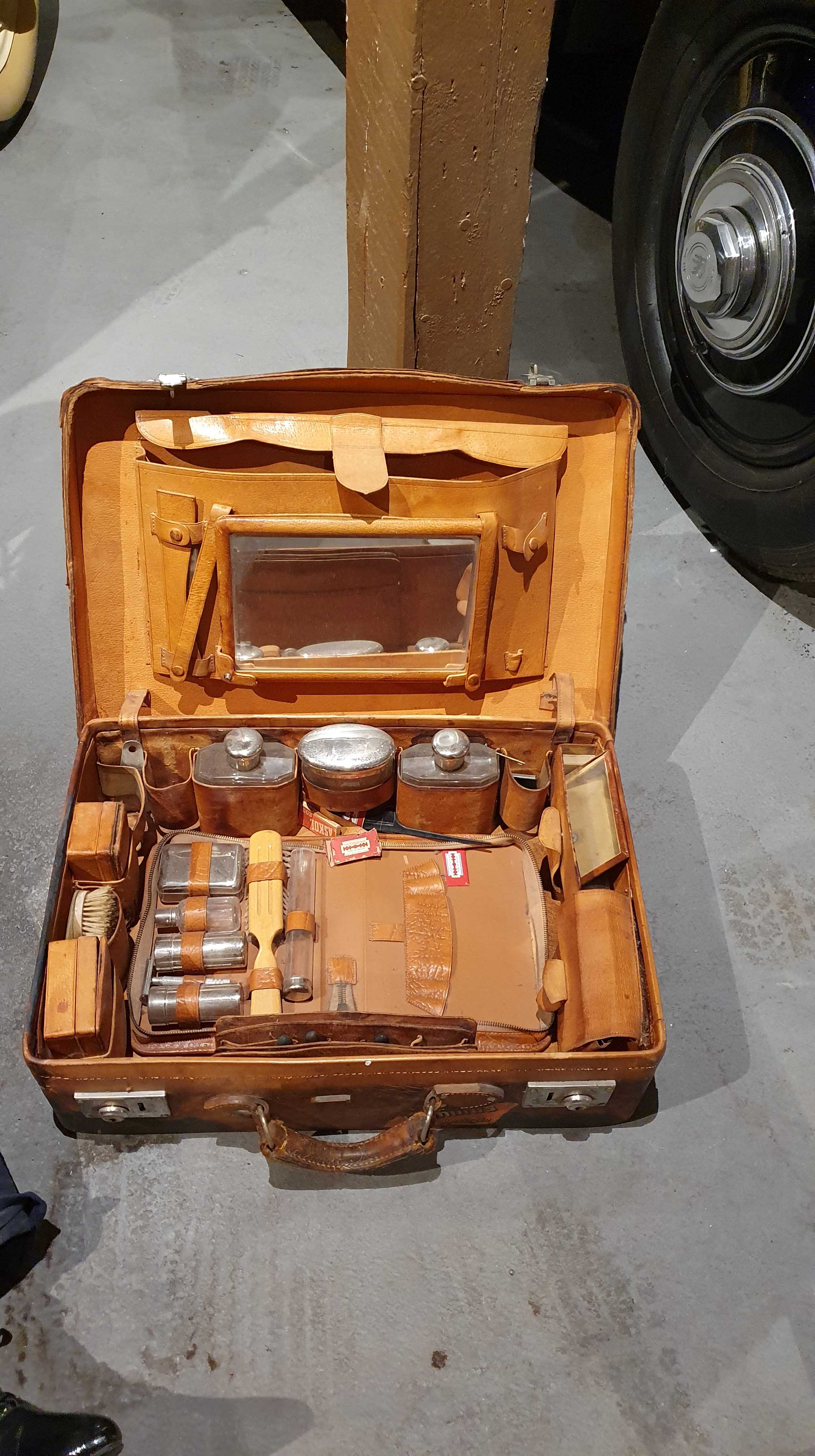 Intill elbilen låg denna otroligt flotta läderväska med allt en man kunde tänkas behöva för att göra sig fin på resan: kam och hårborste, rakdon med tillhörande spegel, skoborste … Undrar vad som fanns i flaskorna? Luktegott kanske. Och vad hade man i det stora facket bakom spegeln, tro?