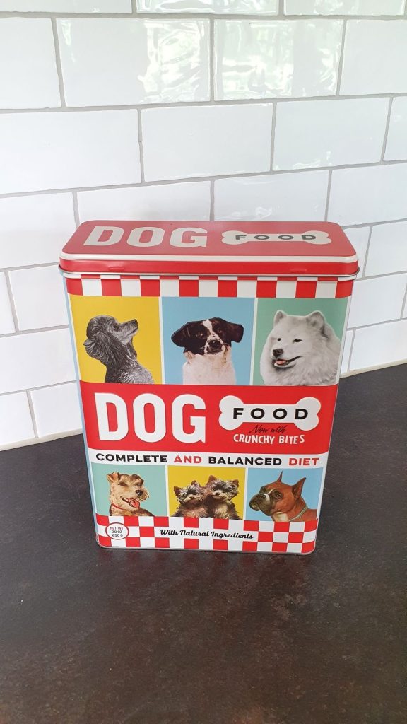 I muséebutiken hittade vi denna retrohundmatsburk. Visst är den fin?! Den fick följa med hem som ett minne av Fendis första hotellvistelse och vårt besök i Motala.
