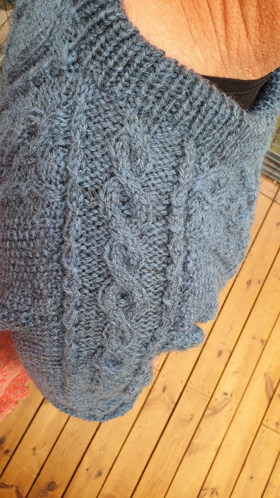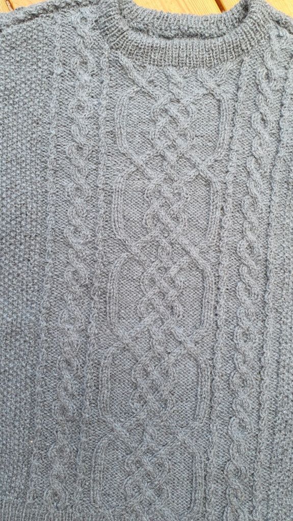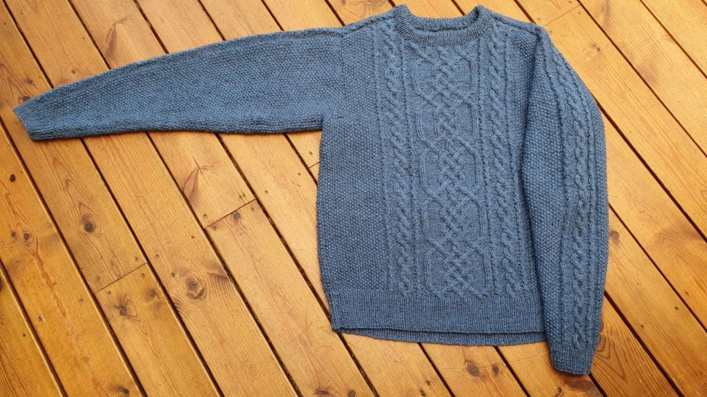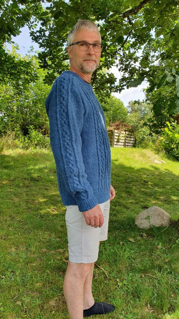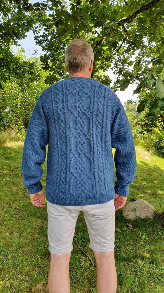 Inte på ett tag i alla fall … David, min ena svärson, fyllde 40 mitt under pandemin och han blev aldrig riktigt firad så jag tänkte kompensera det med att ge honom något jag gjort själv, något som jag lagt ner mycket tid och kärlek på. Och nog har det tagit tid. Jag började någon gång förra våren. Du kan läsa om starten här. David fick önska hur tröjan skulle se ut och han visste ganska direkt att han ville ha en Aran-tröja vilket jag tyckte var spännande för jag har aldrig stickat nåt liknande. I början gick det ganska fort framåt, se här, sen kom lite annat emellan, men nu, ungefär ett år senare är tröjan klar. Jag hade tänkt ge David tröjan när vi var i torpet, men p.g.a. intermezzot jag skrev om här blev inte tröjan klar förrän vi kommit hem därifrån. Så Uffe, min man, har tröjan på sig på fototför att man ska få en uppfattning om hur den ser ut på.