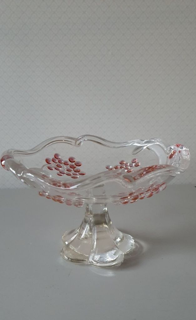 Det här fina glasfatet på fot med röda vindruvor som dekor fick jag också på senaste gratisloppisen, hade faktiskt köpt röda vindruvor att bjuda på så de fick ligga fatet.