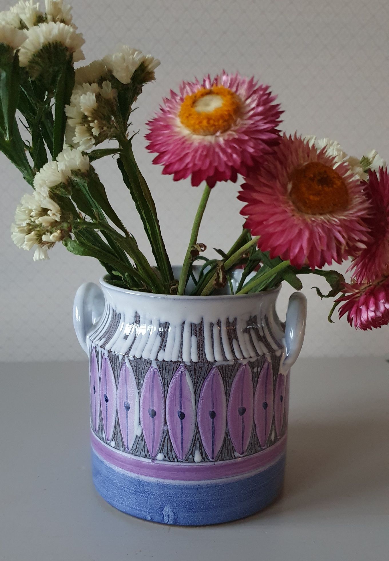 Vår syförening firar 40 år i år! Vår gemensamma nämnare var från början att vi alla var textillärare. Nu jobbar inte alla längre, men intresset för det textila består och de flesta av oss har fortfarande med ett handarbete till våra träffar. På senare år har Anne – som jag tror var den som initierade syföreningen – hittat på en ny aktivitet – gratisloppis. Anne har flyttat från stort hus till lägenhet och har inte längre plats för alla sina saker. En del har såklart hennes barn fått, en del har hon skänkt till välgörenhetsloppisar, men hon har också haft lådor och kassar med på våra träffar med diverse spännande innehåll som hon packat upp och låtit oss välja bland. Sist träffades vi här hemma hos mig och då valde jag den här fina krukan i milda pastellfärger. I botten står det att det är Laholmskeramik och det känns lite roligt när vi bor utanför Halmstad, grannstaden. .