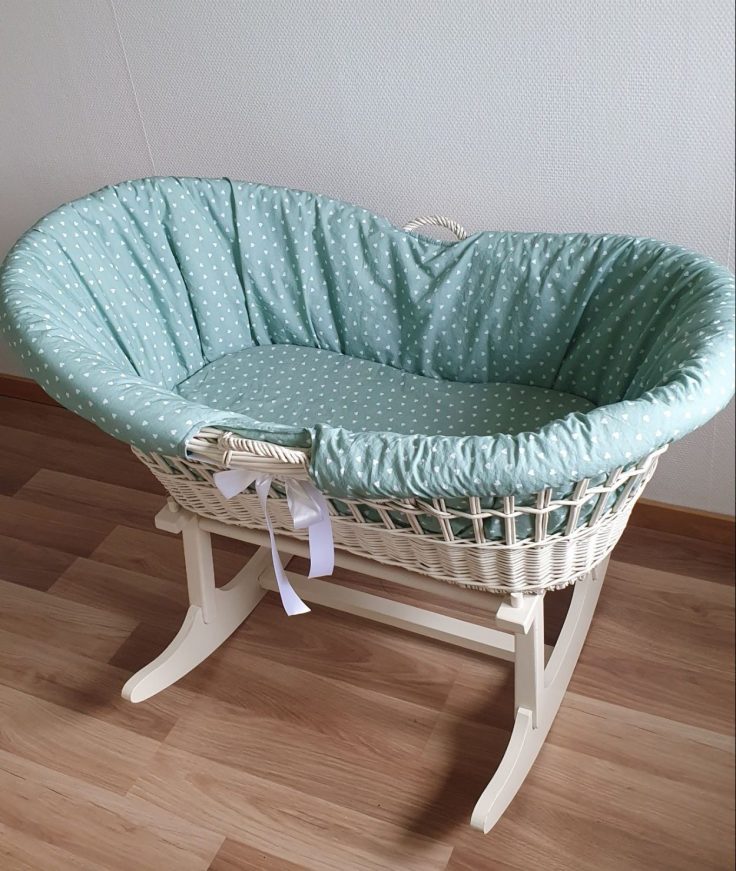 Alla önskemål är uppfyllda: avtagbar klädsel till både vagga och madrass, ingen sufflett och tyget skulle vara i någon grön nyans. Den här nyansen har jag sett kallas vass både hos tyg- och garnaffärer på nätet.