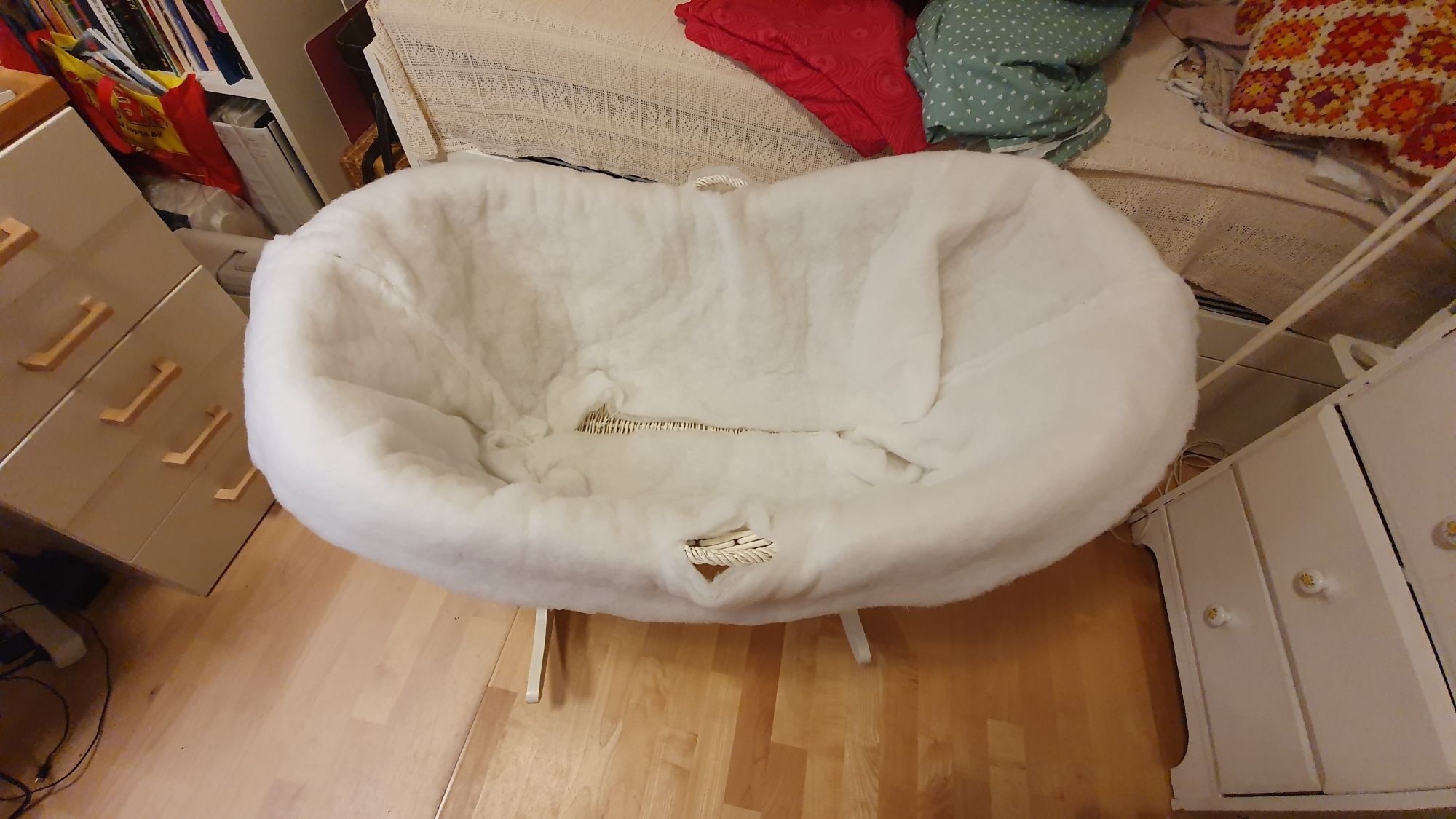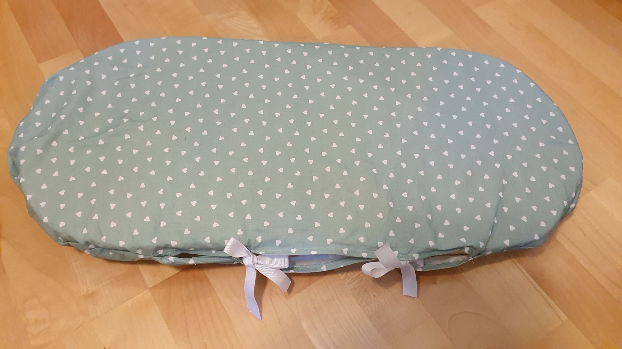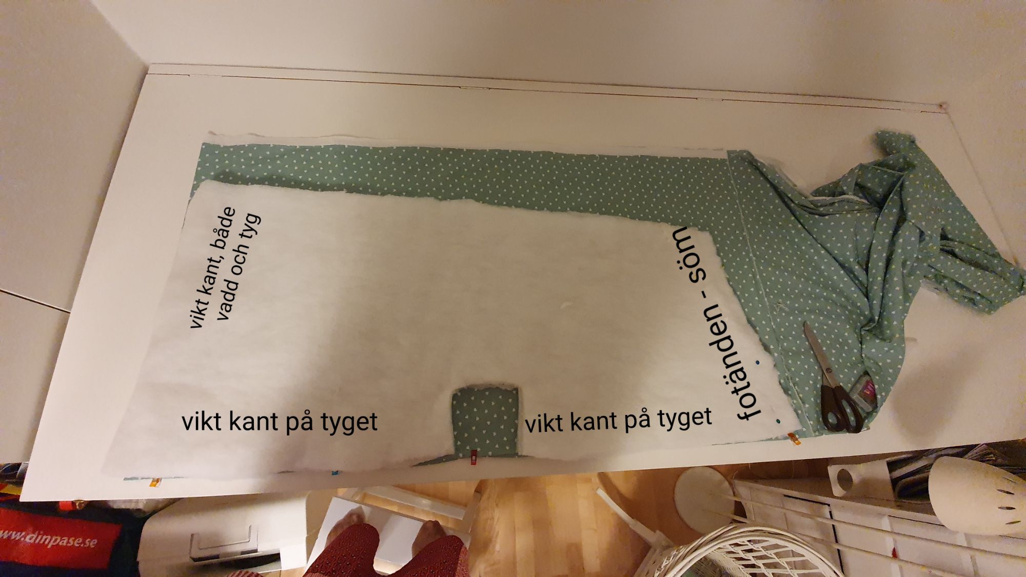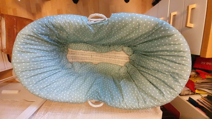 Jag klippte bort vadden på utsidan vid handtagen och använde den som mall när jag klippte ut tyget och sydde ihop tyget ungefär som en ring. Sömmen är vid fotänden av vaggan.