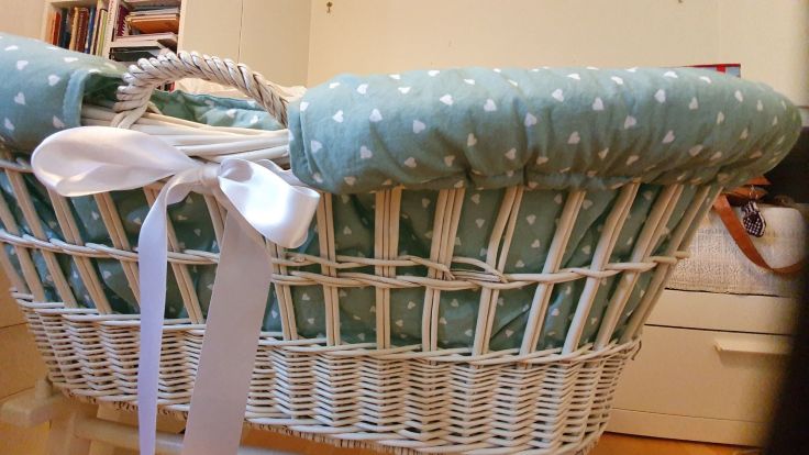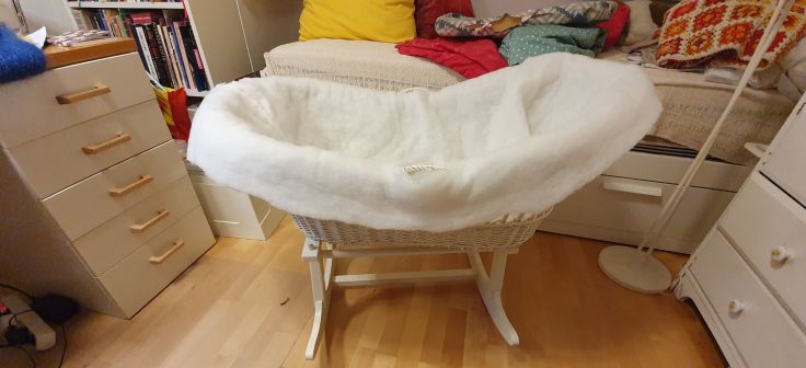 Jag skrev ju häromdagen om mitt senaste projekt – att klä om släktens vagga till ett nytt litet barn som väntas komma i november. Projektet är redan i hamn – jag var så spänd på hur det skulle bli så jag sydde lite då och lite då och – vips var den klar. Jag är så lyckligt lottad att jag har ett syrum där symaskinen kan stå framme och jag kan sprida ut mina grejor utan att det stör nån. Då kan man ta vara på alla småstunder.