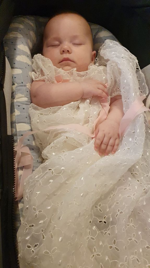 I slutet av september fick vi vara med om en alldeles extra speciell dag när Iris, vårt första barnbarn, döptes. Det var en vacker stund i kyrkan med fint tal av prästen, solosång med gitarrkomp, textläsning av moster My och kusin Oscar hällde dopvattnet i dopfunten. Efteråt var det dopfika med närmare 80 gäster – både små och stora. Inte undra på att Iris sov gott sen. Dopklänningen har både jag, min syster och mina döttrar burit på våra dop så den är lite mer än 60 år nu. Alla namn och dopdatum broderas på nederkanten.