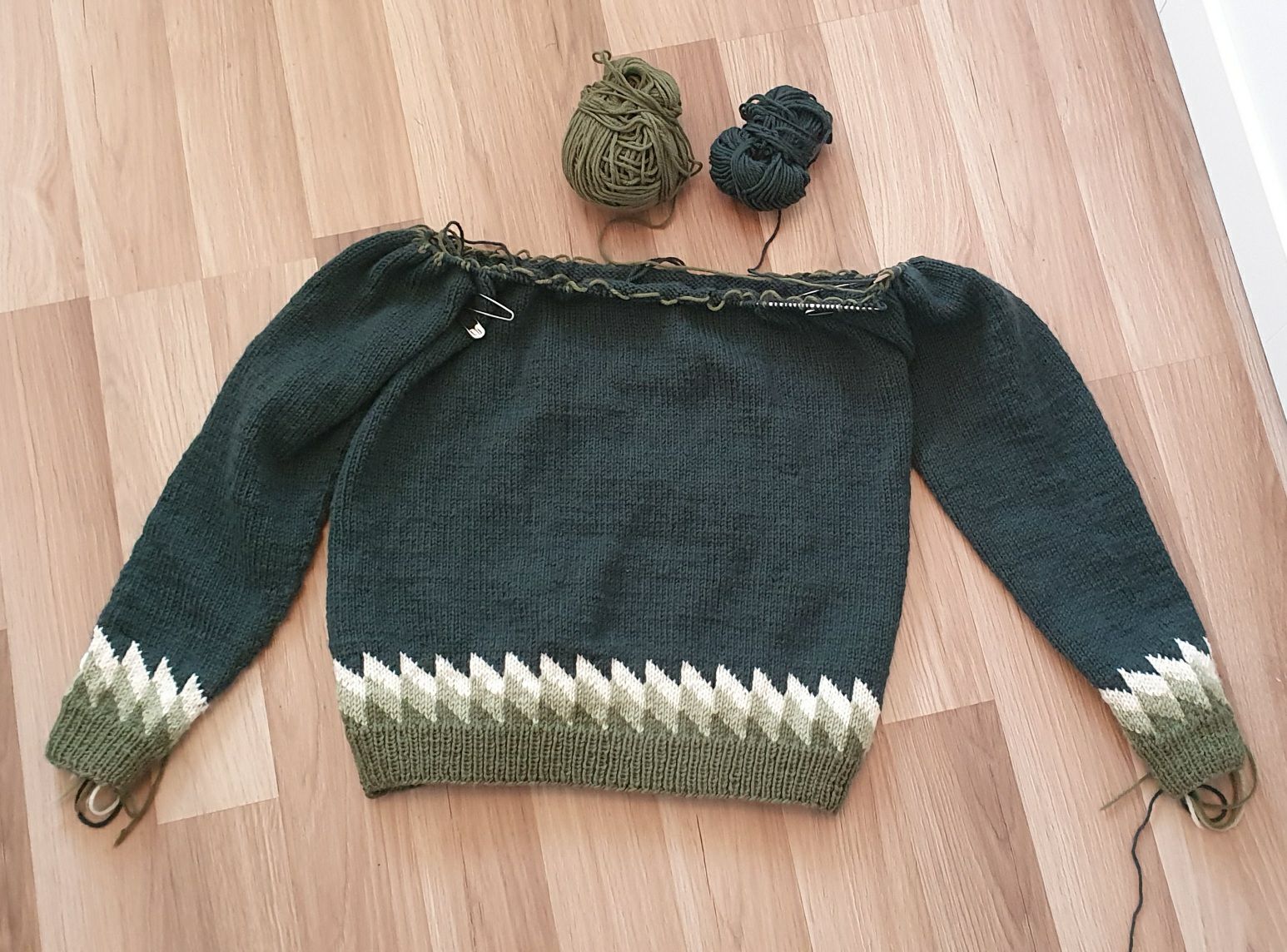 Ett tag kändes det lite motigt, ungefär som jag tror att en del kände det i Vasaloppsspåret. Det var när jag upptäckt att jag råkat sticka ärmarna i en storlek och kroppen i en storlek större. Men efter en del mätande och räknande kom jag fram till att det nog var bra i alla fall, för annars hade kroppen blivit lite tight. Men det blev ju lite krångligt att få maskantalet att stämma med mönsterrapporten. Det löste sig genom att jag stickade ihop summa summarum fyra maskor – två på framstycket och två på bakstycket. Vips så går maskantalet jämnt ut med antalet maskor per rapport och det blir hela mönsterrapporter runt om.