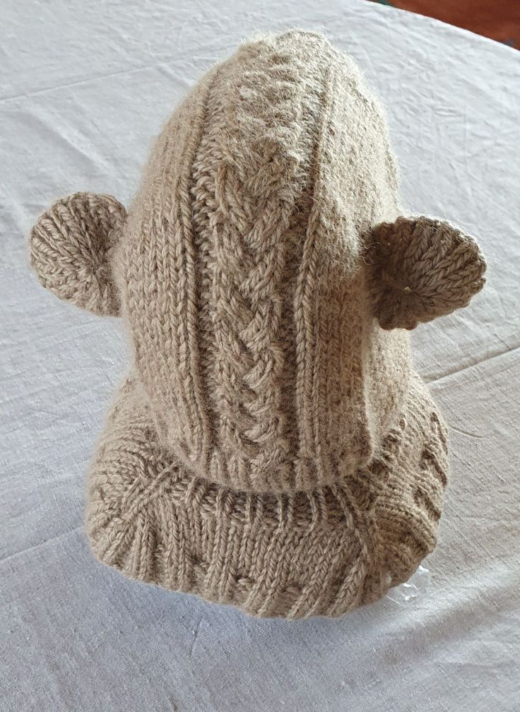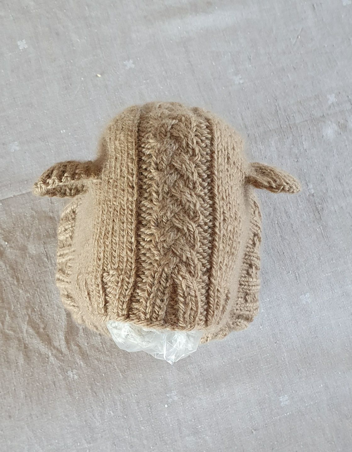 Den här bilden är för att jag ska komma ihåg hur jag sydde fast öronen – om jag skulle vilja göra nån mer nallemössa. Det finns en jättesöt jul-variant i rött och vitt i boken. Så såg alltså mössan ut innan jag tvättade upp och blockade den.