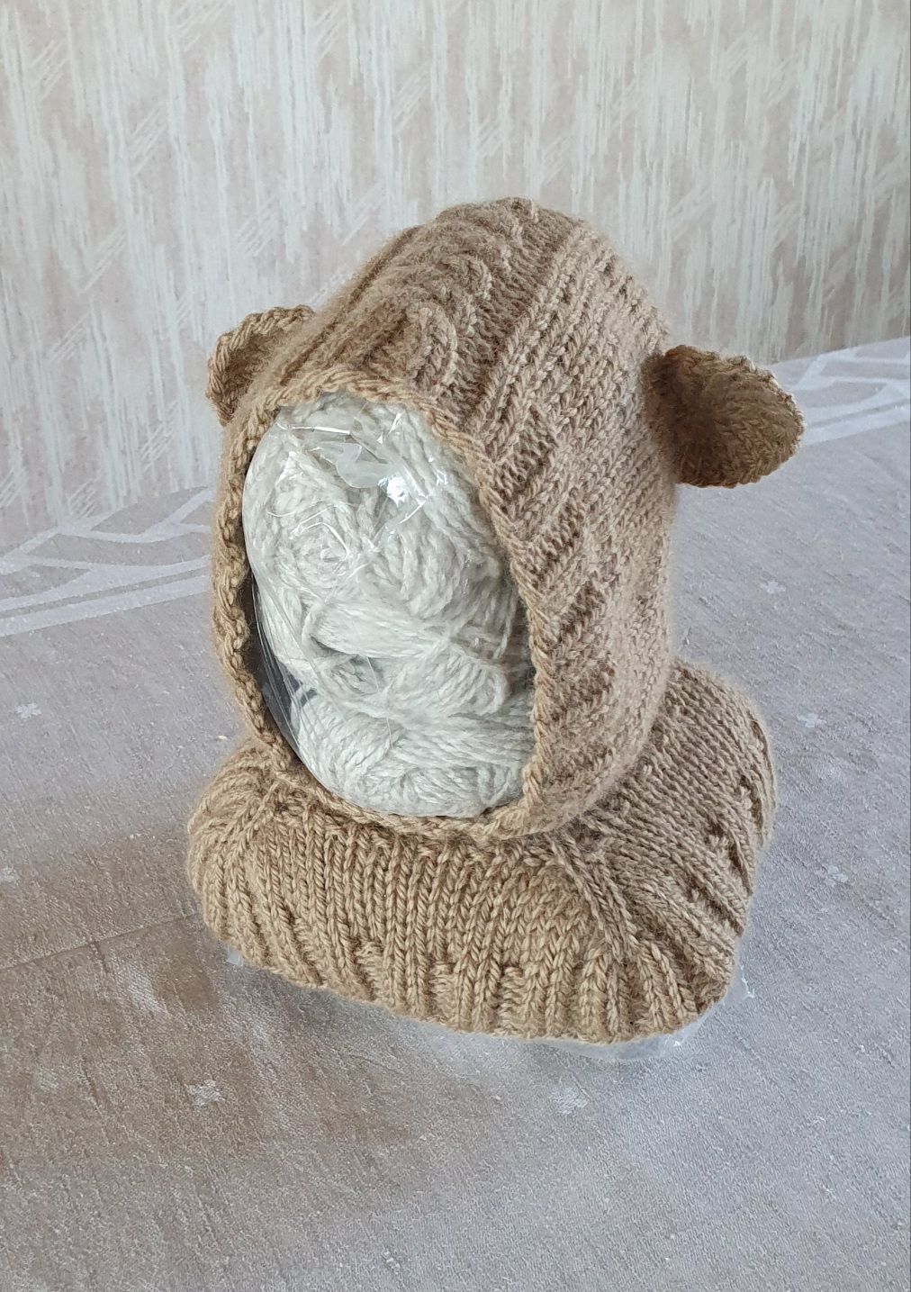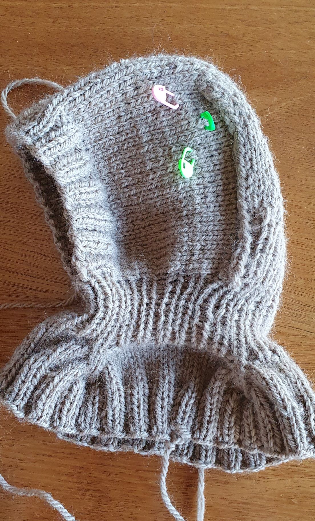 Jag tycker den är fin med flätan som löper över hjässan och fortsätter ner i nacken och jag tror att den kommer blir praktisk när mössa och värmande krage sitter ihop såhär.