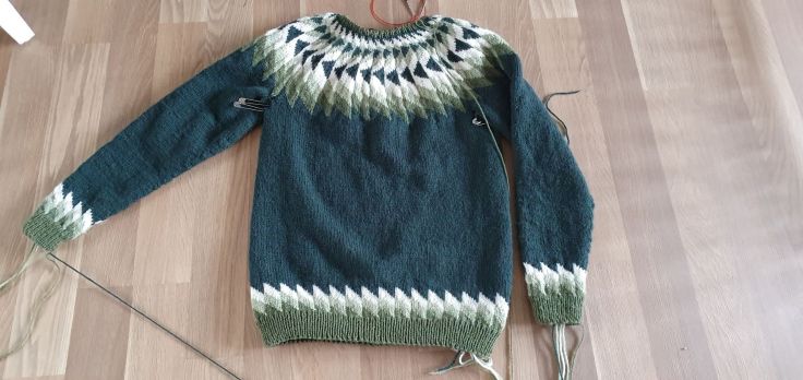 Nu vill jag ha smakråd! Den här ska bli en födelsedagspresent till min svärson. Enligt mönstret ska den avslutas med mörkgrön resår upptill, men garnet tog slut ett varv in på resåren och istället för att direkt beställa ett nystan till testade jag att sticka med den olivgröna färgen – lite för att resårerna nertill ju faktiskt har den färgen. Det blev bra, tycker jag, men nu funderar jag på att repa upp det mörkgröna strax under resåren och byta ut det mot olivgrönt också – för att få till en halsavslutning som ännu mer liknar de andra kanterna.