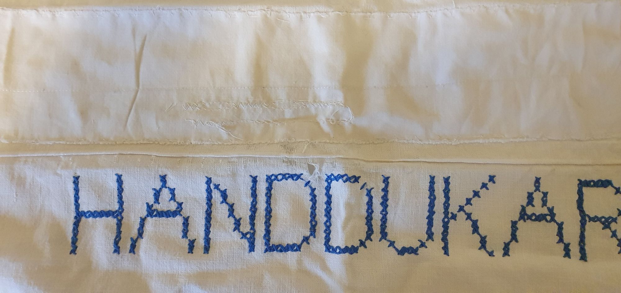 Jag vek upp broderiet HANDDUKAR över de tidigare lagningar så att de ligger som en förstärkning under broderiet, sydde fast med raksöm och lite trestegs-sicksack vid hålet vid bokstaven D.
