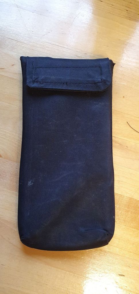 Han använder mobilen i arbetet och vill ha den lättillgänglig så jag har sytt ett mobilfodral av en gammal datorväska. En bit av axelremmen blev hälla att trä livremmen igenom.