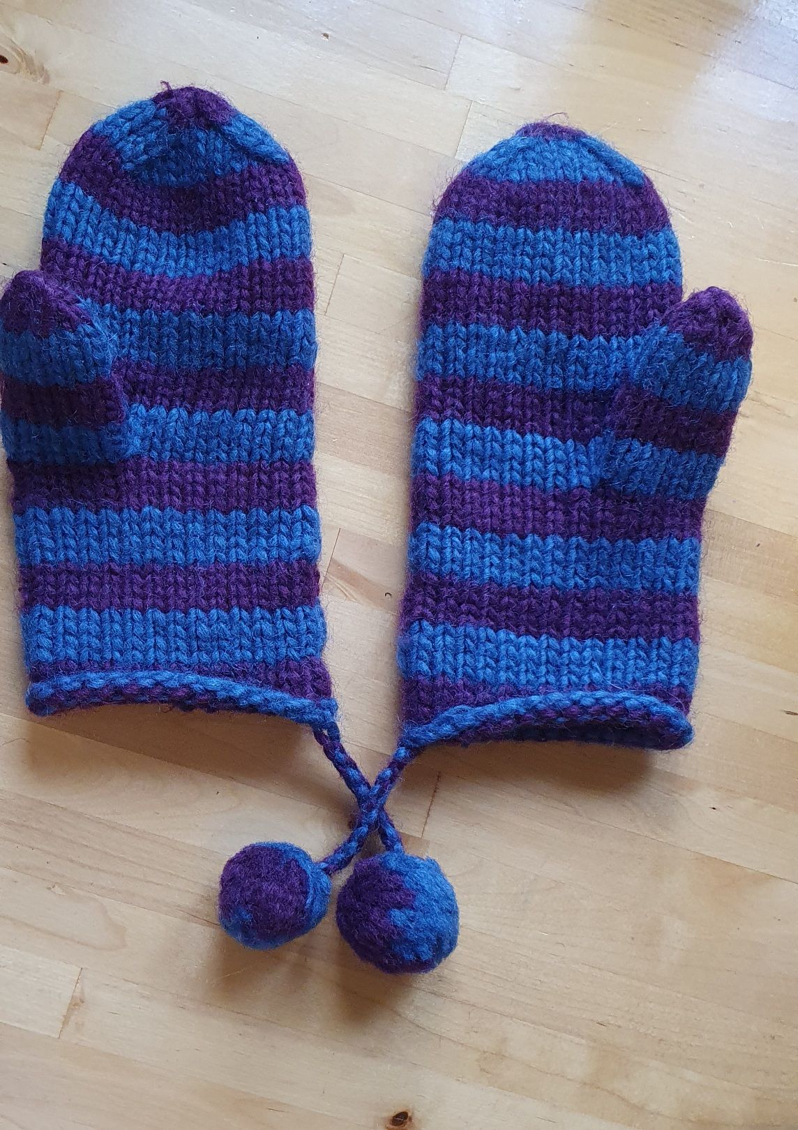 Jag tycker mycket om de här vantarna, köpte garn och beskrivning till dem i hemslöjdsaffären i Halmstad när den ännu fanns. De fingerpåtade snoddarna med sina garnbollar är bra när vantarna behöver hängas på tork – man bara snor dem om varandra och vips kan man hänga dem över torklinan.