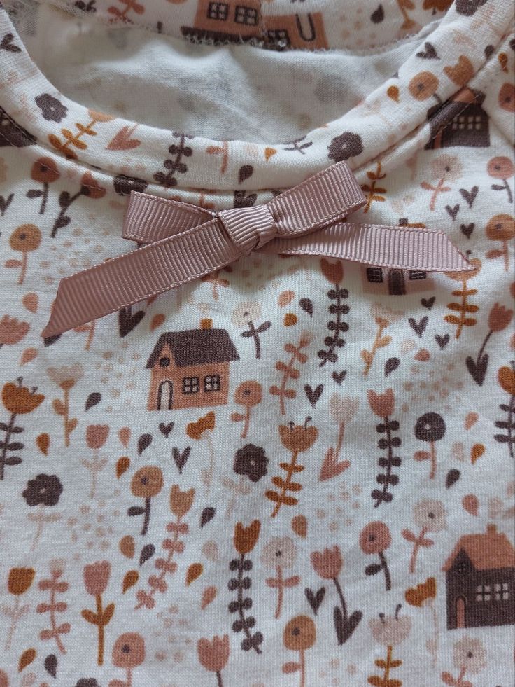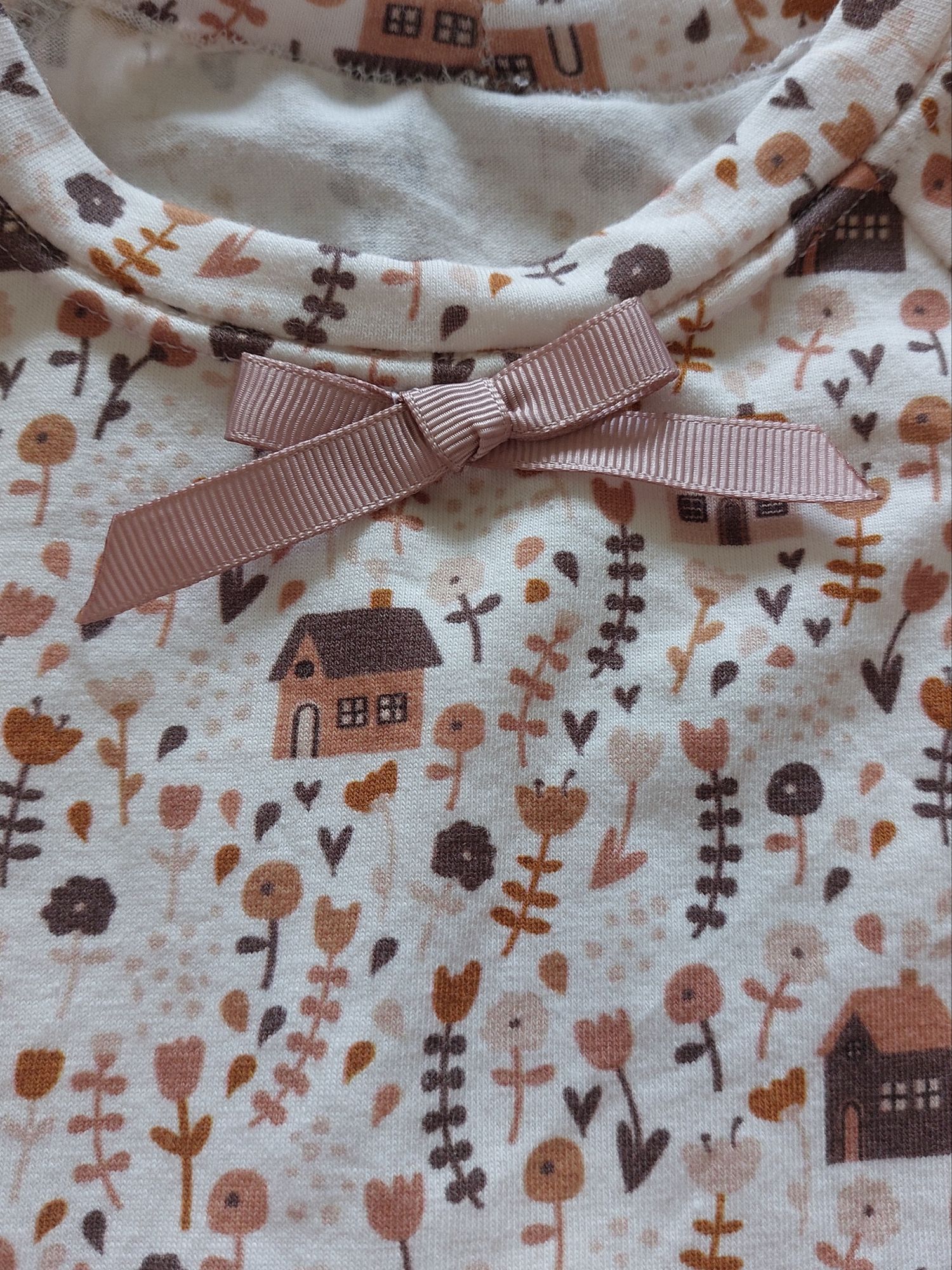 Innan jag åkte till Stockholm hann jag sy en dress att ta med till Iris. Hennes mamma gillar inte gulligt rosa så det blev brunt. Men jag kunde inte låta bli att gulla till det lite med en rosett.