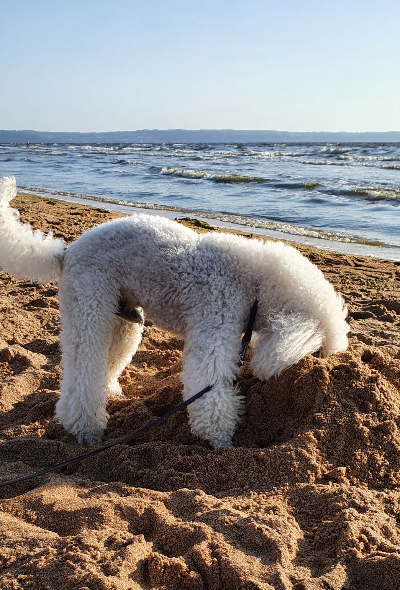 Uffes första semestervecka tillbringade vi i stugan i Mellbystrand. Första kvällen gick vi en lång promenad längs stranden. Sedan några år tillbaka får hundar får vara på stranden mellan kl. 18 och 8 sommartid och Fendi gillade verkligen att få gräva fritt i sanden.