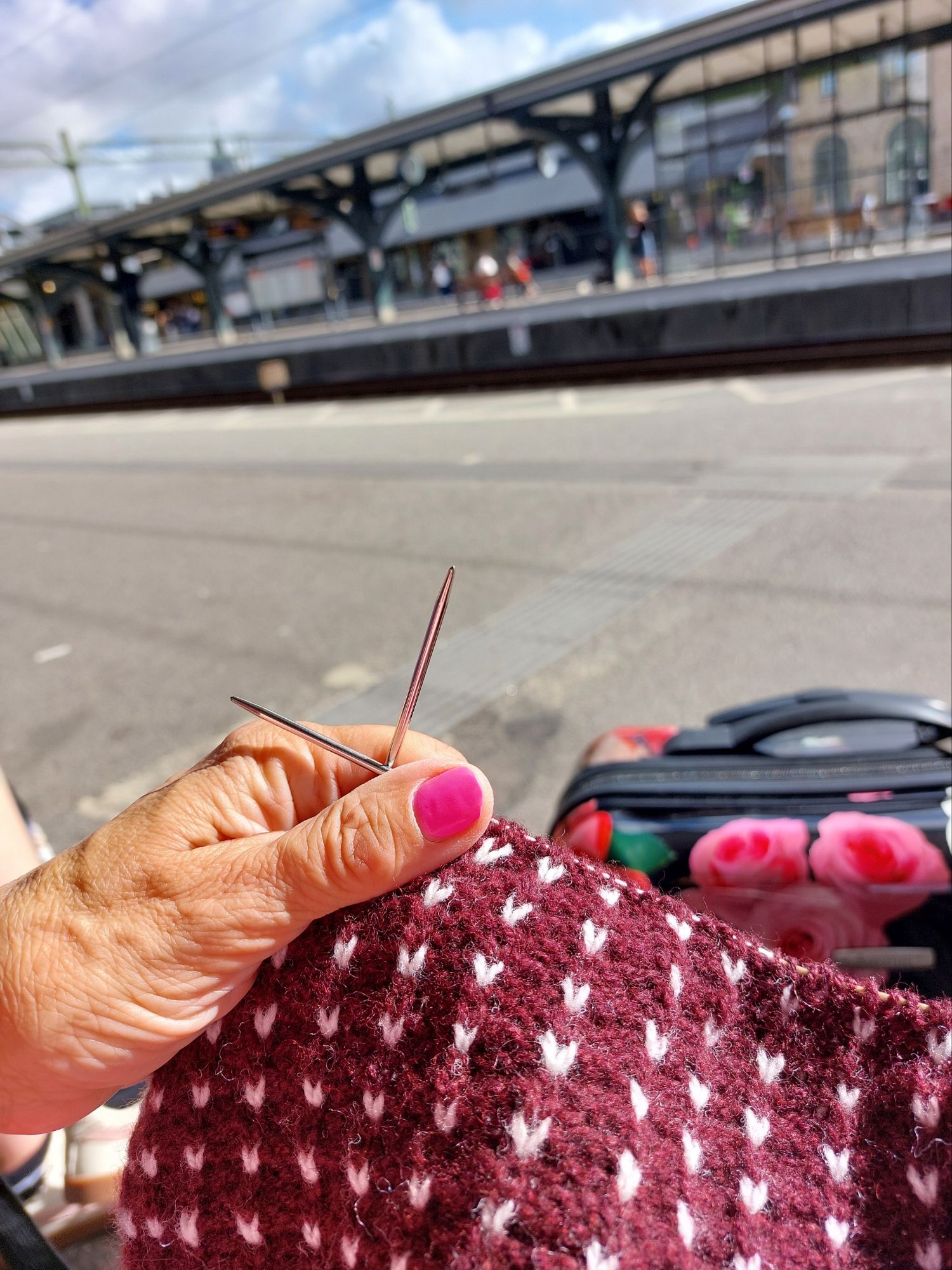 Jag är glad att jag gjorde mig besväret att åka till grannstaden för att köpa en ny sticka, för tåget var försenat och då kändes det bra att ha något för händer. Här sitter jag och stickar på Lunds station. Visst är det tokigt att åka söderut och sen norrut, men jag valde den rutten för att kunna åka med SJ hela vägen, vis av tidigare erfarenheter. Väljer man att resa med olika bolag är det inte säkert att man får tillbaka alla pengar om man skulle behöva boka om. Och nu fixade ju SJ att jag kom med nästa tåg mot Stockholm utan en massa krångel.