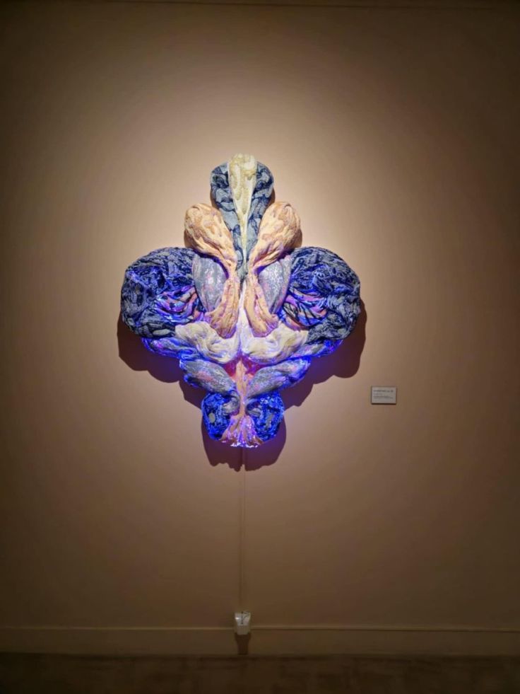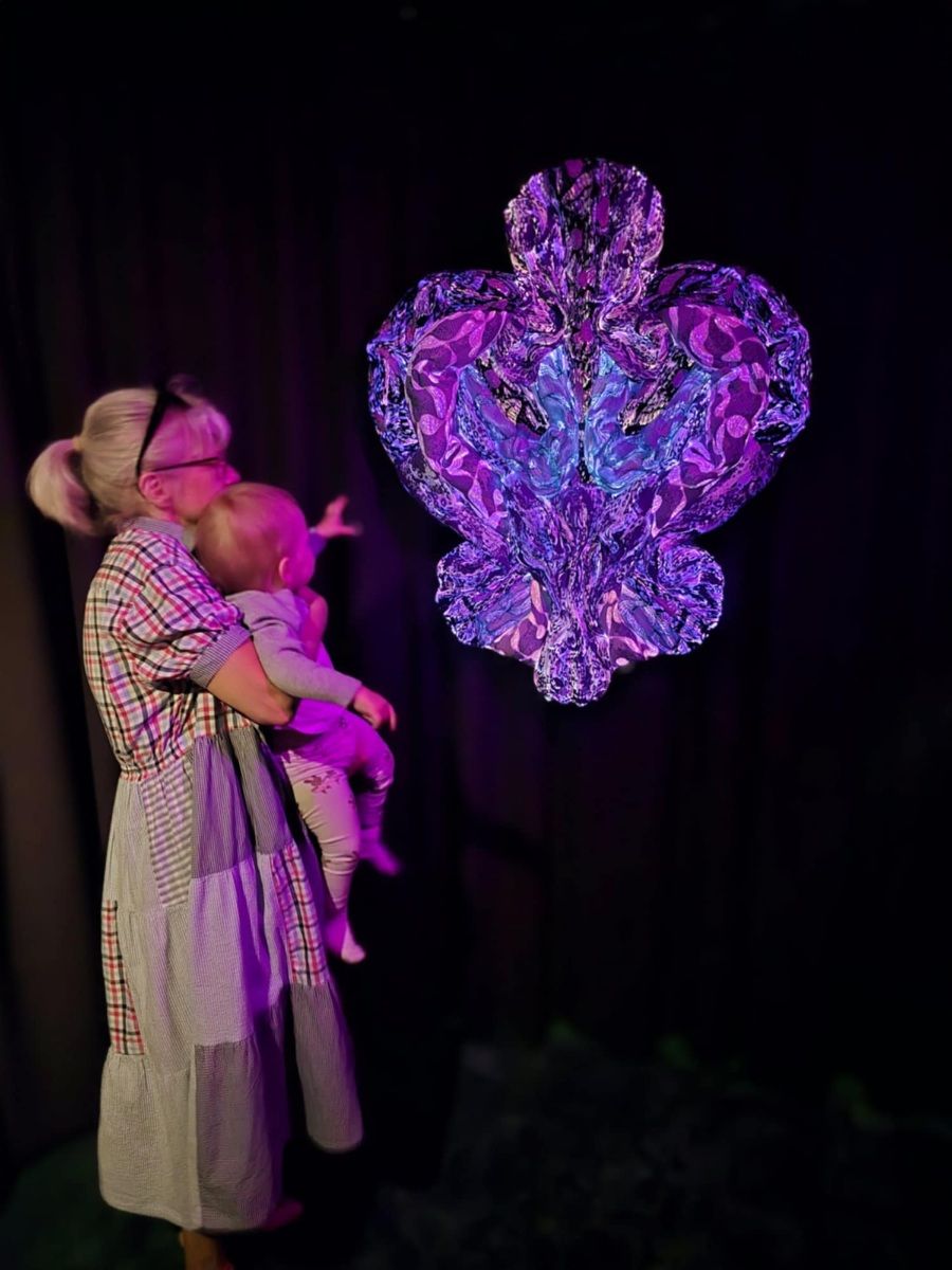 Det här blev ett långt inlägg, men jag måste bara få berätta om en utställning som vi var på: utställningen Andetag, skapad av Malin och Gustav Tadaa. Malin har vävt tyg med optiska fibrer i. Av dessa tyger har hon sedan skapat skulpturer som skiftar färg i takt med hennes inspelade andetag. Detta är en totalupplevelse där ljud, ljus och färg samspelar och utställningen måste upplevas på plats för att göras rättvisa, men jag visar ändå några bilder här – med tillåtelse från personal på plats såklart.