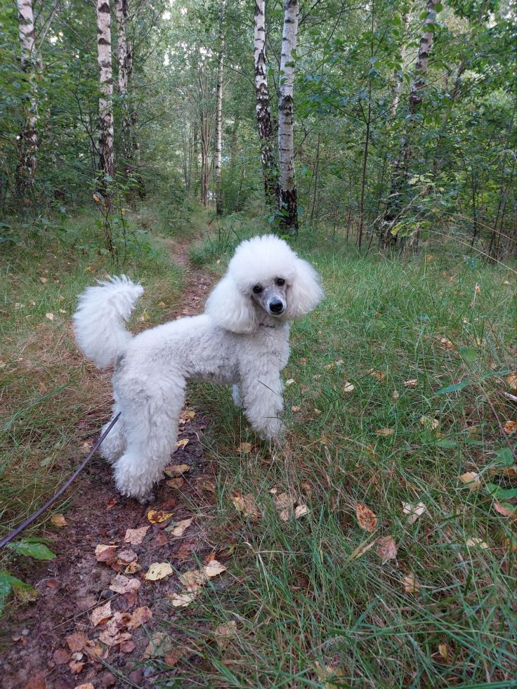 Nu är allt som det brukar – Fendi är hemma igen efter att ha varit hos sin uppfödare för parning. Här är vi på vår första morgonpromenad sedan han kom hem. Fendi valde väg. Just den här stigen följer vi annars inte så ofta.
