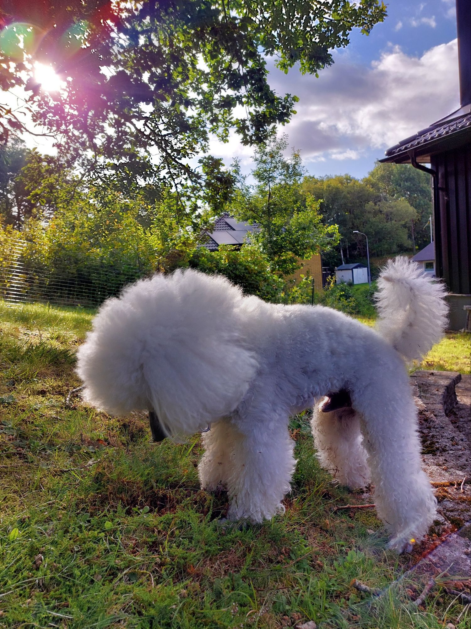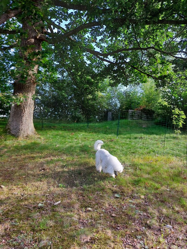 Vi har ett par stora ekar på tomten och när Fendi kom till oss var jag rädd att han skulle äta ekollon om han fick gå själv på tomten så det fick han inte när han var valp. Vi har inget staket runt tomten så när han blev äldre och intresset för ekollon verkade svalna kunde vi ju ha satt upp ett, men ni vet hur det är – ibland krånglar man till det: Var skulle vi sätta staket? Runt hela tomten? För dyrt och för krånligt! Bara på framsidan? Då, när jag började mina efterforskningar sa kommunens regler att om vi ville ha staket på framsidan skulle vi inte få bygga så högt som skulle behövas för att Fendi inte skulle kunna hoppa över det. Stakethöjden skulle på den tiden räknas från gatunivå och inte tomtnivå. Så då gick det alternativet bort. Men nu när Fendi skulle komma hem igen ville jag överraska honom lite, övergav de storstilade planerna på ett riktigt staket och tog fram alla kompostgaller vi hade och byggde en hage på baksidan av vårt hus. Baksidan blir bättre med tanke på att han inte kan inte springa som ett jehu längs tomten och skälla ut allt och alla som passerar på framsidan.