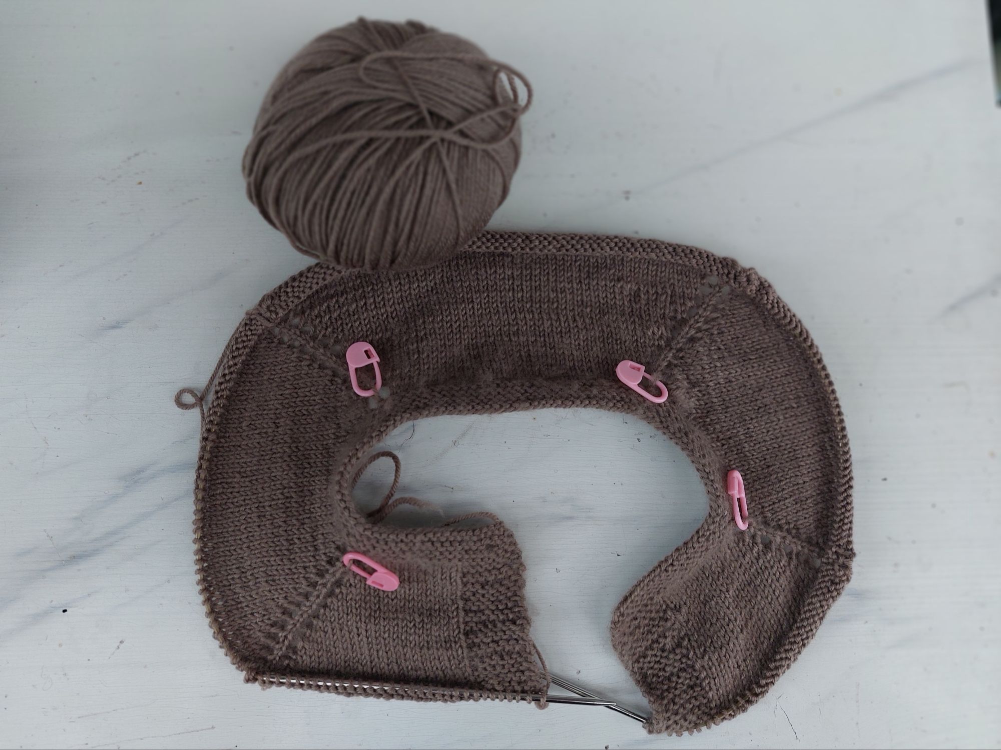 Koftan stickas uppifrån och ner och man ökar genom att göra omslag på var sida markörerna. Vid ett tillfälle hade jag råkat göra fler omslag än det skulle vara.