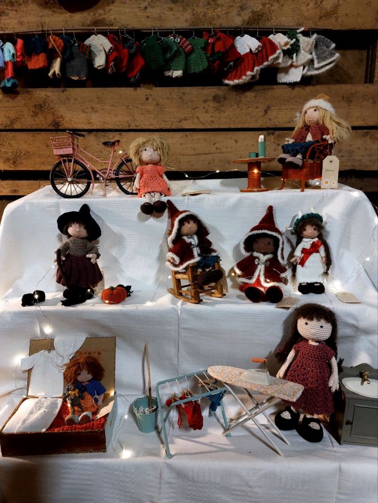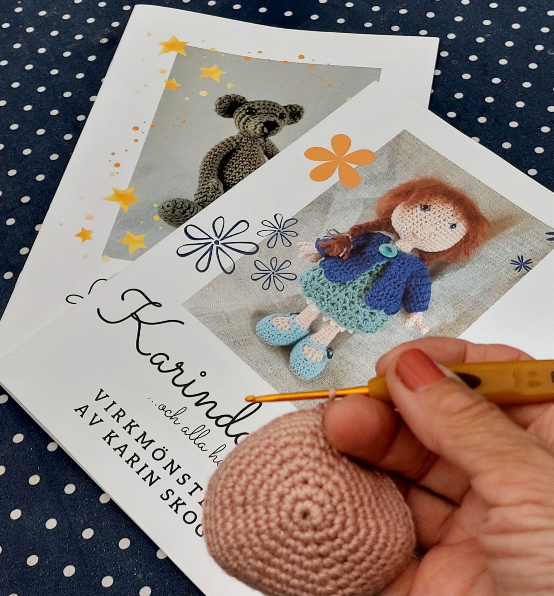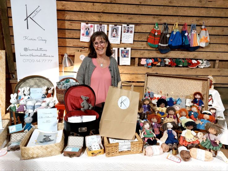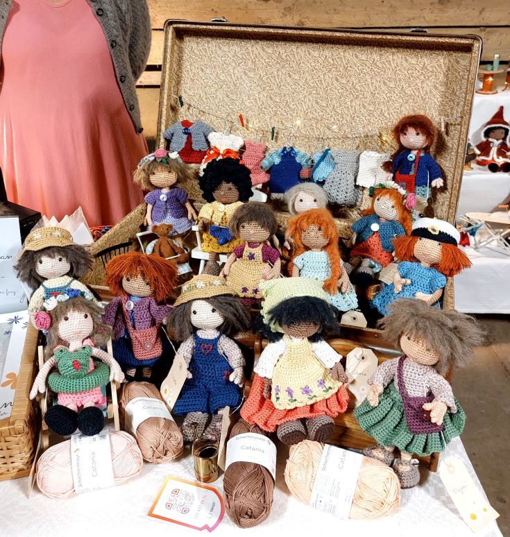 Man kunde köpa materialkit och beskrivningar men också färdiga dockor och djur. Med tanke på mina två små barnbarn köpte jag inte en utan två, virkbeskrivningar. Nallen är ju bara så söt och vem kan motstå en Karin-docka med hel garderob, allt virkat? Inte jag, i alla fall.