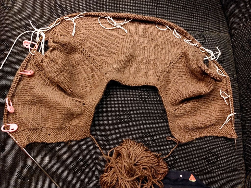 Den här stickningen följde med som  min resestickning på min resa till Eskilstuna. Det ska bli en Erantis-kofta till Iris, äldsta barnbarnet. Tyvärr hade jag inte läst igenom beskrivningen ordentligt innan jag åkte hemifrån, så jag missade att ta med tillräckligt med stickmarkörer. Som tur var hade jag tagit med en bit bomullsgarn för att kunna sätta ärm-maskorna på och den räckte precis till att även knyta provisoriska markörer med.