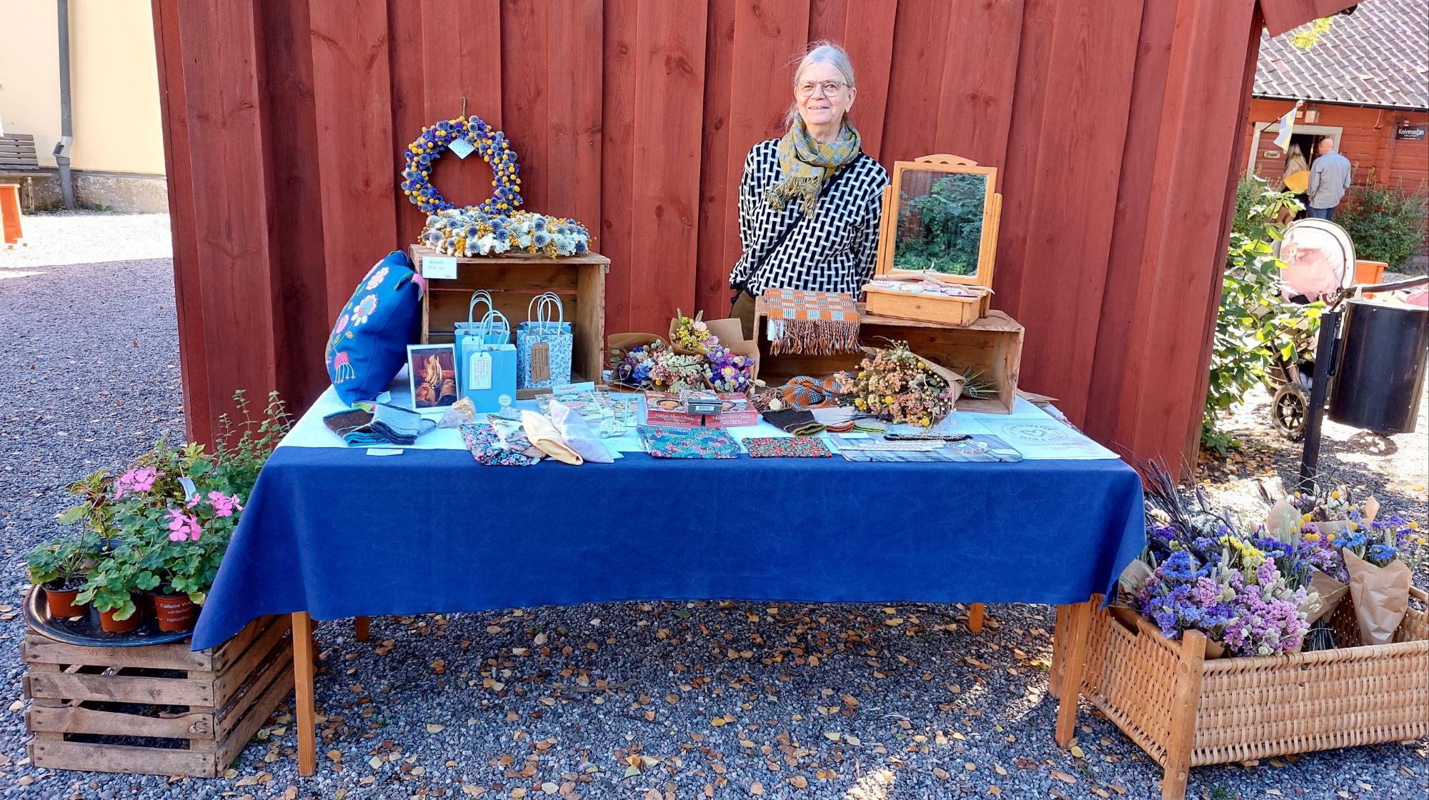 Inne i den lilla röda stugan, Lilla verkstan, bakom Elisabet finns en butik där hon och hennes skapande vänner i vanliga fall säljer sina alster. Jag var allt lite sugen på ett litet broderi-kit till ett yllebroderi, men den här gången lyckades jag hålla mig. Min pudel-kudde som har en given plats i vår blå skinnsoffa måste broderas färdig innan soffan blivit utsliten