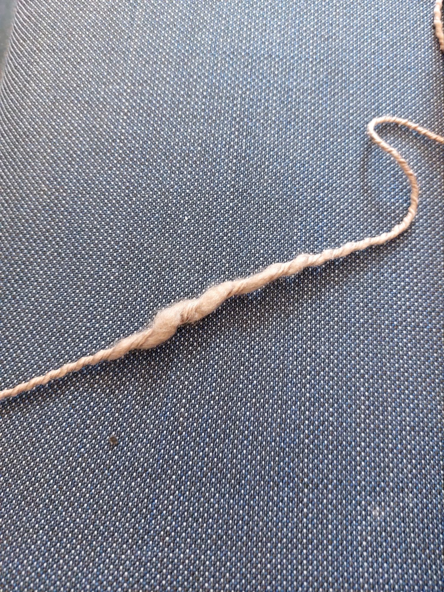 Mitt i första nystanet dök en sån här klump upp. Jag provade att sticka in den, men det blev inte fint så jag fick repa upp, klippa av den bit som var klumpig och knyta ihop garnet provisoriskt. När koftan är klar får jag fästa ändarna. Det går att göra snyggare än vad resultatet blev när jag stickade in klumpen.