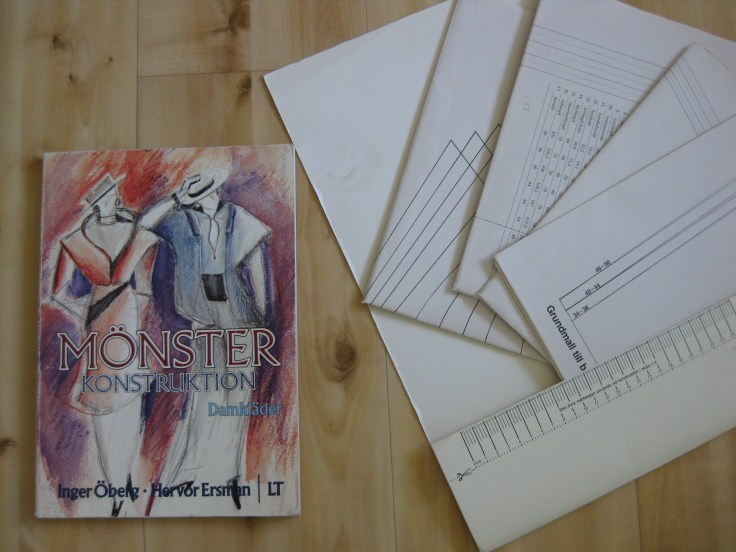 Resten av eftermiddagen har jag ägnat åt förberedelser inför sy-lanet som ska vara i oktober. Jag har två fina ylletyger, ett grått och ett i min favoritfärg mörklila med dragning åt aubergine. Jag funderar på att frångå min vana att sy klänningar och istället pröva att sy långbyxor av de här tygerna. Det är lite knepigare att sy byxor än klänningar för de måste liksom passa i en dimension till – jag tänker på grenen, alltså hur de sitter mellan benen från midjan, runt och upp till ryggslutet. När jag gick textillärarutbildningen gjorde vi grundmönster till både överdel, kjol och byxor, men det var två graviditeter och en hel del godis sedan så det kändes lika bra att börja om från början. Jag utgick från grundmönstren i den här boken: