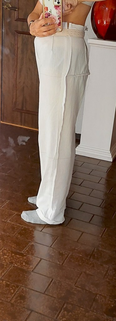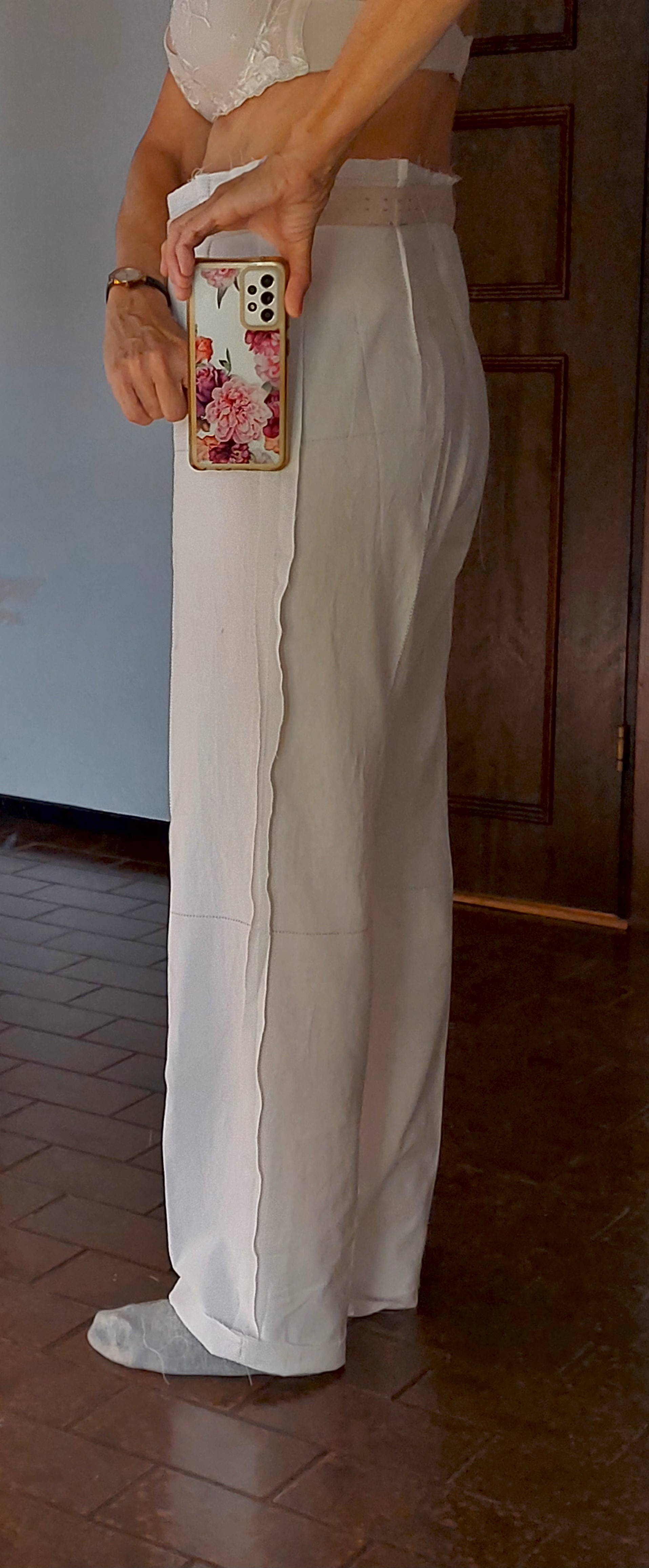 och sydde en provbyxa av ett gammalt lakan. Jag tog några foton för att själv försöka se hur min provbyxa satt. Det gick väl sådär – svårt att fotografera sig själv från sidan och lakansväven var väldigt urtvättad och mjuk.