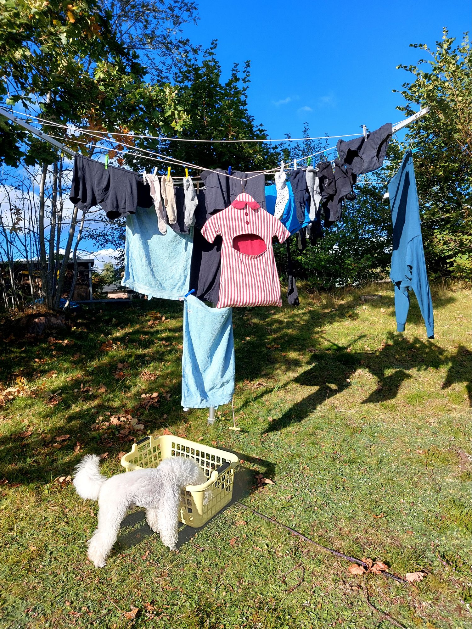 När vi kommit hem från promenaden hjälpte Fendi mig med tvätten. Jag älskar doften av soltorkad tvätt, tycker det är vardagslyx att kunna hänga ut min tvätt på tork i trädgården. Lade du förresten märke till klänningspåsen som jag förvarar mina tvättklämmor i? Mitt gamla klädnypsförkläde hade tjänat ut, så när vi renoverade tvättstugan sydde jag den här istället efter en beskrivning som du hittar här.